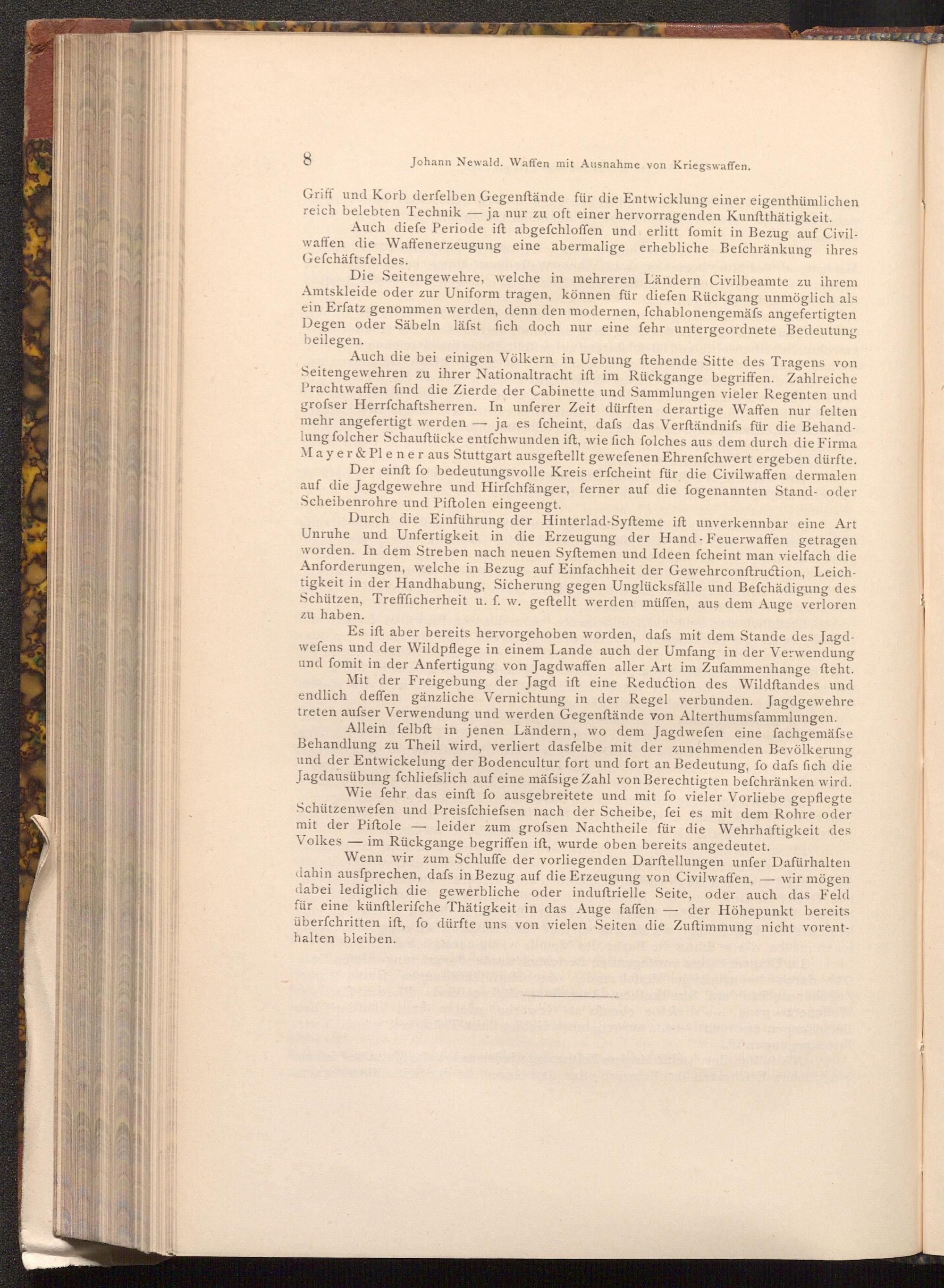Allein felbft in jenen Ländern, wo dem Jagdwefen eine fachgemässe Behandlung zu Theil wird, verliert dasfelbe mit der zunehmenden Bevölkerung und der Entwickelung der Bodencultur fort und fort an Bedeutung, fo dafs fich die Jagdausübung fchliefslich auf eine mäfsige Zahl von Berechtigten befchränken wird. Wie fehr das einft fo ausgebreitete und mit fo vieler Vorliebe gepflegte Schützenwefen und Preisfchiefsen nach der Scheibe, fei es mit dem Rohre oder mit der Piftole leider zum grofsen Nachtheile für die Wehrhaftigkeit des Volkes im Rückgange begriffen ift, wurde oben bereits angedeutet. Wenn wir zum Schluffe der vorliegenden Darftellungen unfer Dafürhalten dahin ausfprechen, dafs in Bezug auf die Erzeugung von Civilwaffen, wir mögen dabei lediglich die gewerbliche oder induftrielle Seite, oder auch das Feld für eine künftlerifche Thätigkeit in das Auge faffen- der Höhepunkt bereits überfchritten ift, fo dürfte uns von vielen Seiten die Zuftimmung nicht vorenthalten bleiben.