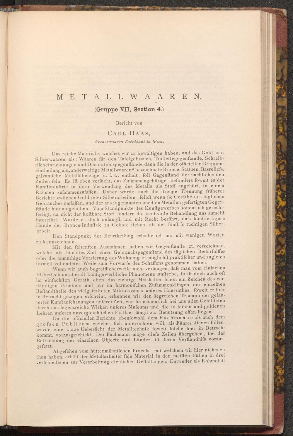 Das reiche Materiale, welches wir zu bewältigen haben, und das Gold und Silberwaaren, als: Waaren für den Tafelgebrauch, Toillettegegenftände, Schreibtifcheinrichtungen und Decorationsgegenstände, dann die in der officiellen Gruppeneintheilung als, anderweitige Metallwaaren" bezeichnete Bronce, Statuen, Basreliefs, galvanifche Metallüberzüge u. f. w. enthält, foll Gegenftand der nachftehenden Zeilen fein. Es ift eben verfucht, das Zufammengehörige, befonders foweit es der Kunftinduftrie in ihrer Verwendung des Metalls als Stoff angehört, in einem Rahmen zufammenzufaffen. Daher wurde auch die ftrenge Trennung früherer Berichte zwifchen Gold oder Silberarbeiten, felbft wenn fie Geräthe des täglichen Gebrauches umfaffen, und der aus fogenannten unedlen Metallen gefertigten Gegenftände hier aufgehoben. Vom Standpunkte des Kunstgewerbes hoffentlich gerechtfertigt, da nicht der koftbare Stoff, fondern die kunftvolle Behandlung uns zumeift intereffirt. Wurde es doch unlängft und mit Recht berührt, dafs kunftfertigere Hände der Bronce- Induftrie zu Gebote ftehen, als der fonft fo tüchtigen Silberarbeit.