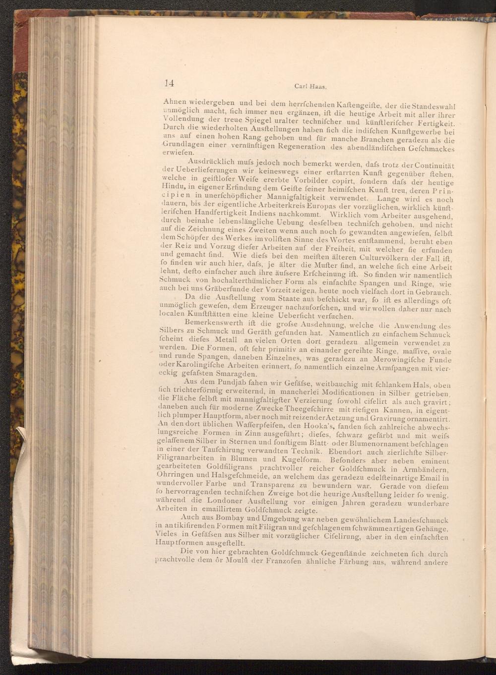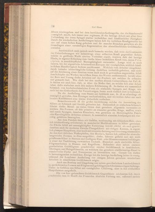 Ausdrücklich mufs jedoch noch bemerkt werden, dafs trotz der Continuität der Ueberlieferungen wir keineswegs einer erftarrten Kunft gegenüber ftehen, welche in geiftlofer Weife ererbte Vorbilder copirt, fondern dafs der heutige Hindu, in eigener Erfindung dem Geifte feiner heimifchen Kunft treu, deren Principien in unerfchöpflicher Mannigfaltigkeit verwendet. Lange wird es noch dauern, bis der eigentliche Arbeiterkreis Europas der vorzüglichen, wirklich künftlerifchen Handfertigkeit Indiens nachkommt. Wirklich vom Arbeiter ausgehend, durch beinahe lebenslängliche Uebung desfelben techniſch gehoben, und nicht auf die Zeichnung eines Zweiten wenn auch noch fo gewandten angewiefen, felbft dem Schöpfer des Werkes im vollften Sinne des Wortes entftammend, beruht eben der Reiz und Vorzug diefer Arbeiten auf der Freiheit, mit welcher fie erfunden und gemacht find. Wie diefs bei den meiften älteren Culturvölkern der Fall ift, fo finden wir auch hier, dafs, je älter die Mufter find, an welche fich eine Arbeit lehnt, defto einfacher auch ihre äufsere Erfcheinung ift. So finden wir namentlich Schmuck von hochalterthümlicher Form als einfachfte Spangen und Ringe, wie auch bei uns Gräberfunde der Vorzeit zeigen, heute noch vielfach dort in Gebrauch. Da die Ausftellung vom Staate aux befchickt war, fo ift es allerdings oft unmöglich gewefen, dem Erzeuger nachzuforfchen, und wir wollen daher nur nach localen Kunftftätten eine kleine Ueberficht verfuchen.
