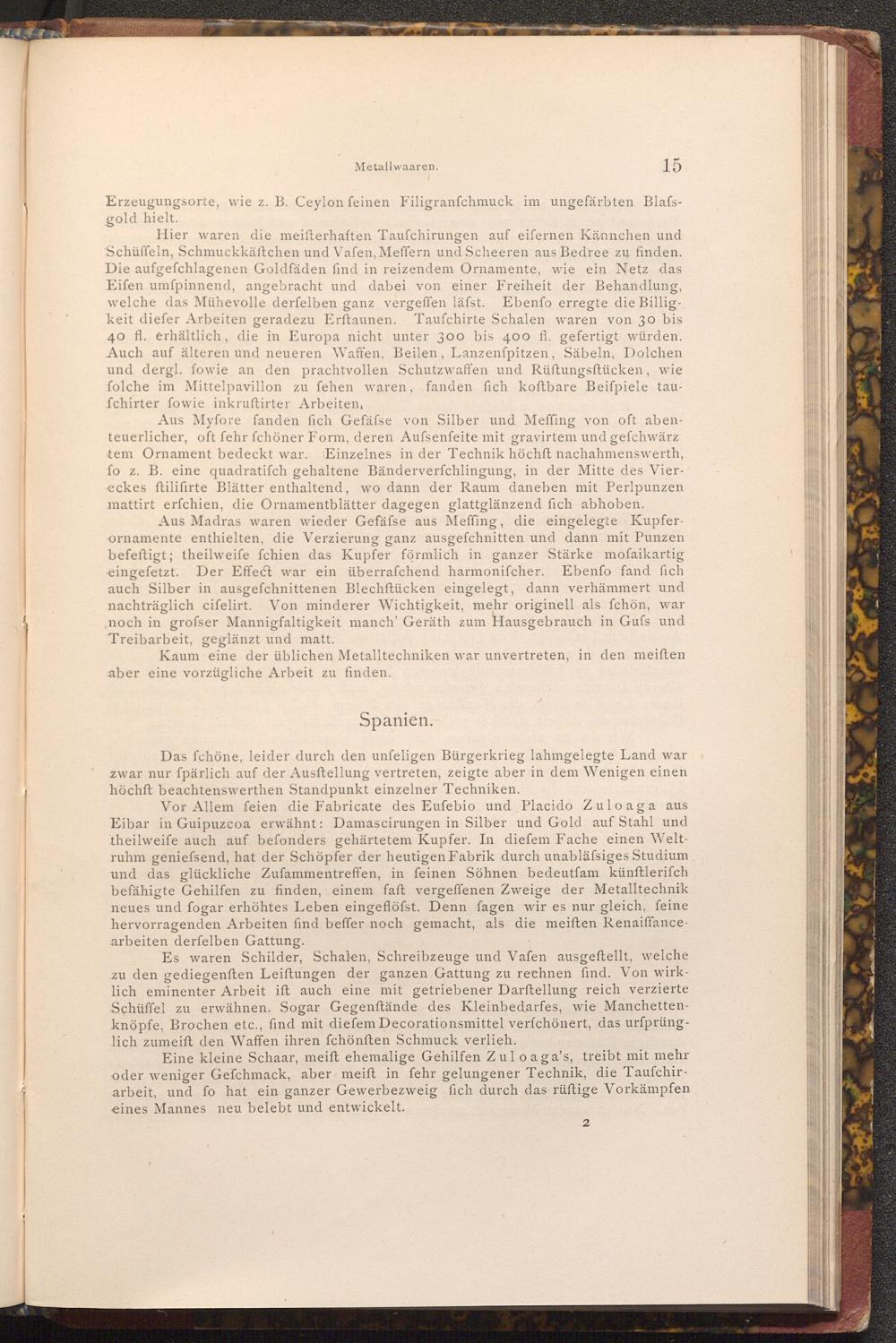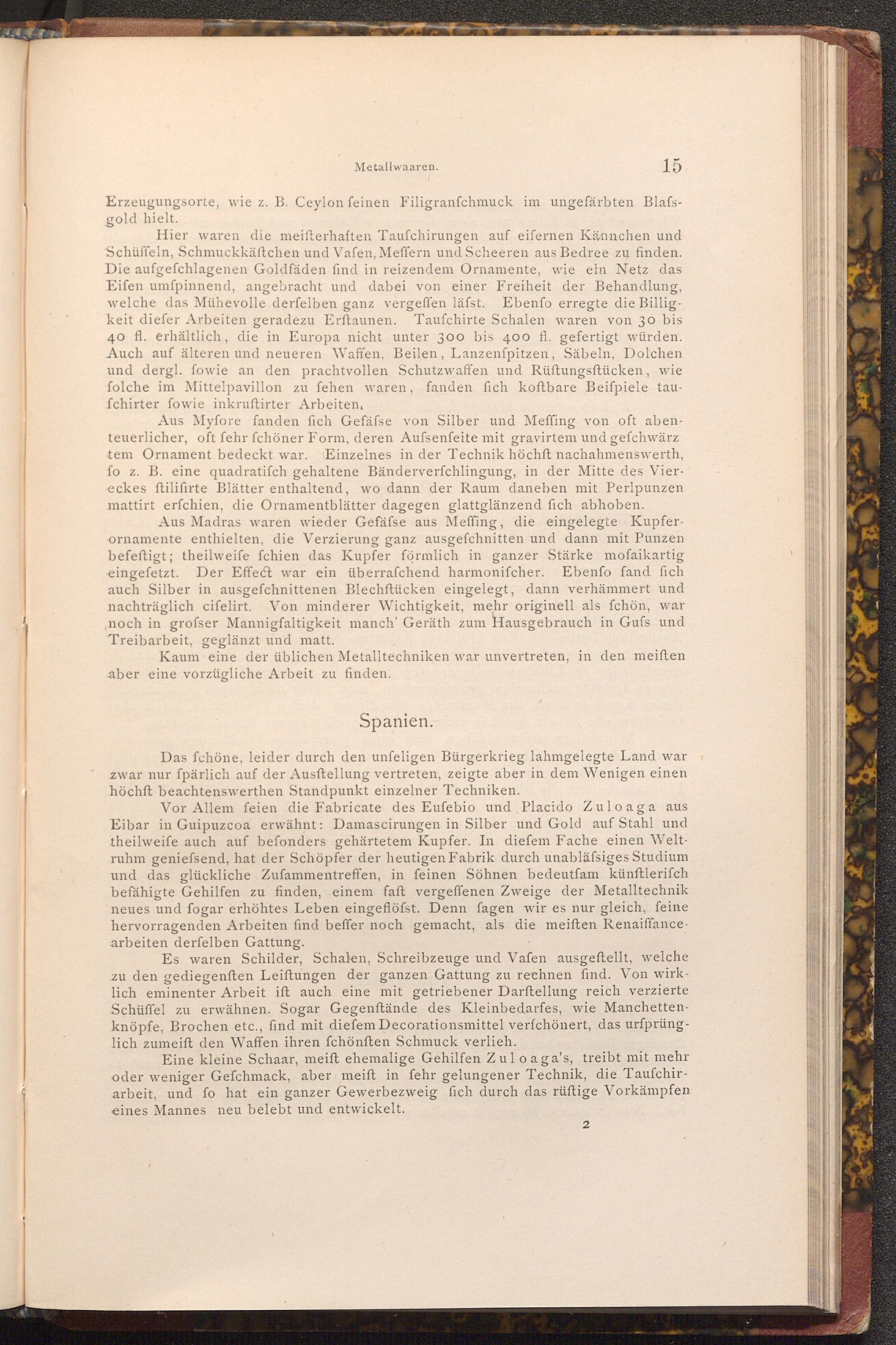 Vor Allem feien die Fabricate des Eufebio und Placido Zuloaga aus Eibar in Guipuzcoa erwähnt: Damascirungen in Silber und Gold auf Stahl und theilweife auch auf befonders gehärtetem Kupfer. In diefem Fache einen Weltruhm geniefsend, hat der Schöpfer der heutigen Fabrik durch unabläfsiges Studium und das glückliche Zufammentreffen, in feinen Söhnen bedeutfam künftlerifch befähigte Gehilfen zu finden, einem faft vergeffenen Zweige der Metalltechnik neues und fogar erhöhtes Leben eingeflöfst. Denn fagen wir es nur gleich, feine hervorragenden Arbeiten find beffer noch gemacht, als die meiften Renaiffancearbeiten derfelben Gattung.