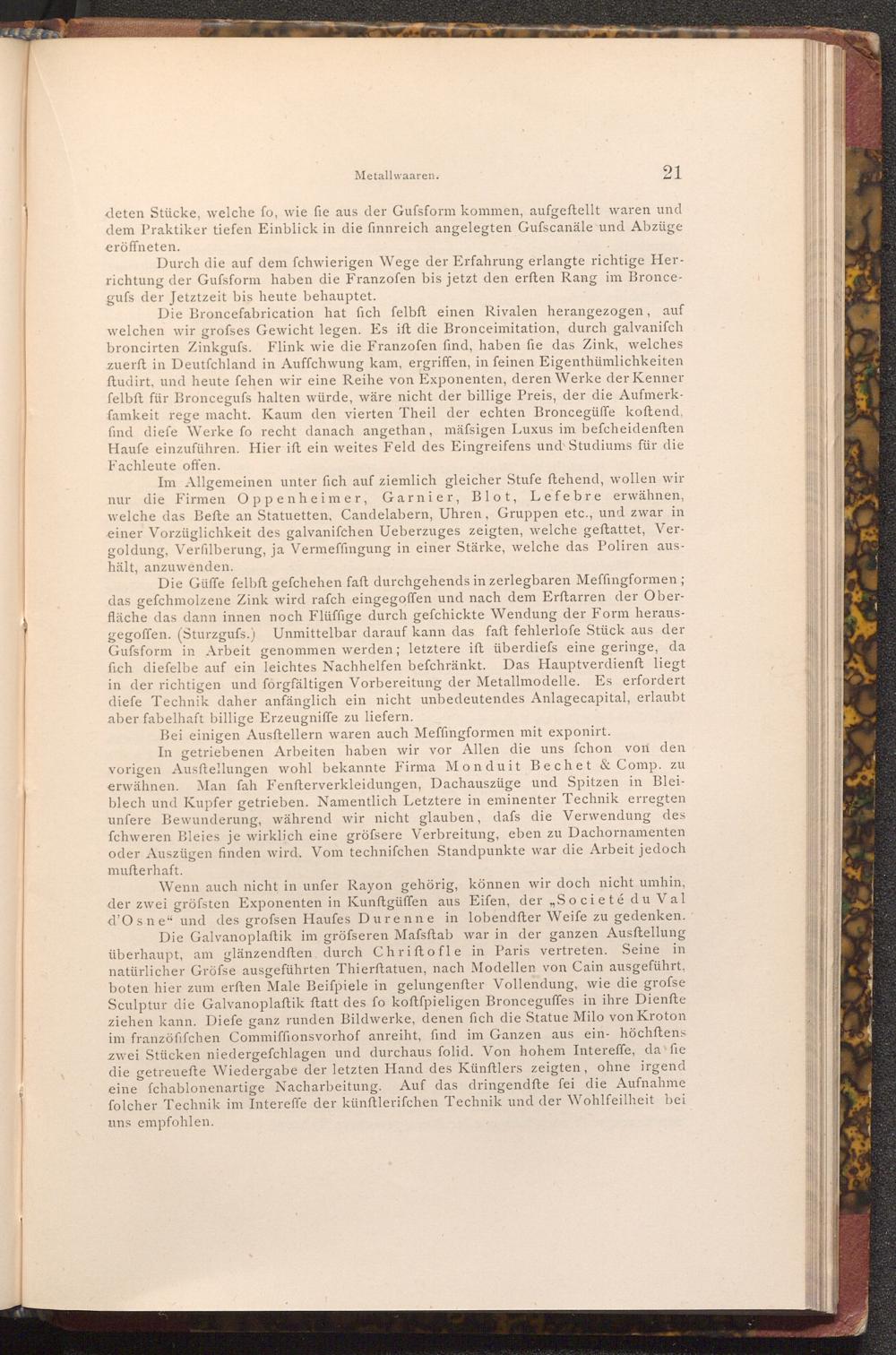 Im Allgemeinen unter fich auf ziemlich gleicher Stufe ftehend, wollen wir nur die Firmen Oppenheimer, Garnier, Blot, Lefebre erwähnen, welche das Befte an Statuetten, Candelabern, Uhren, Gruppen etc., und zwar in einer Vorzüglichkeit des galvanifchen Ueberzuges zeigten, welche geftattet, Vergoldung, Verfilberung, ja Vermeffingung in einer Stärke, welche das Poliren aushält, anzuwenden.
