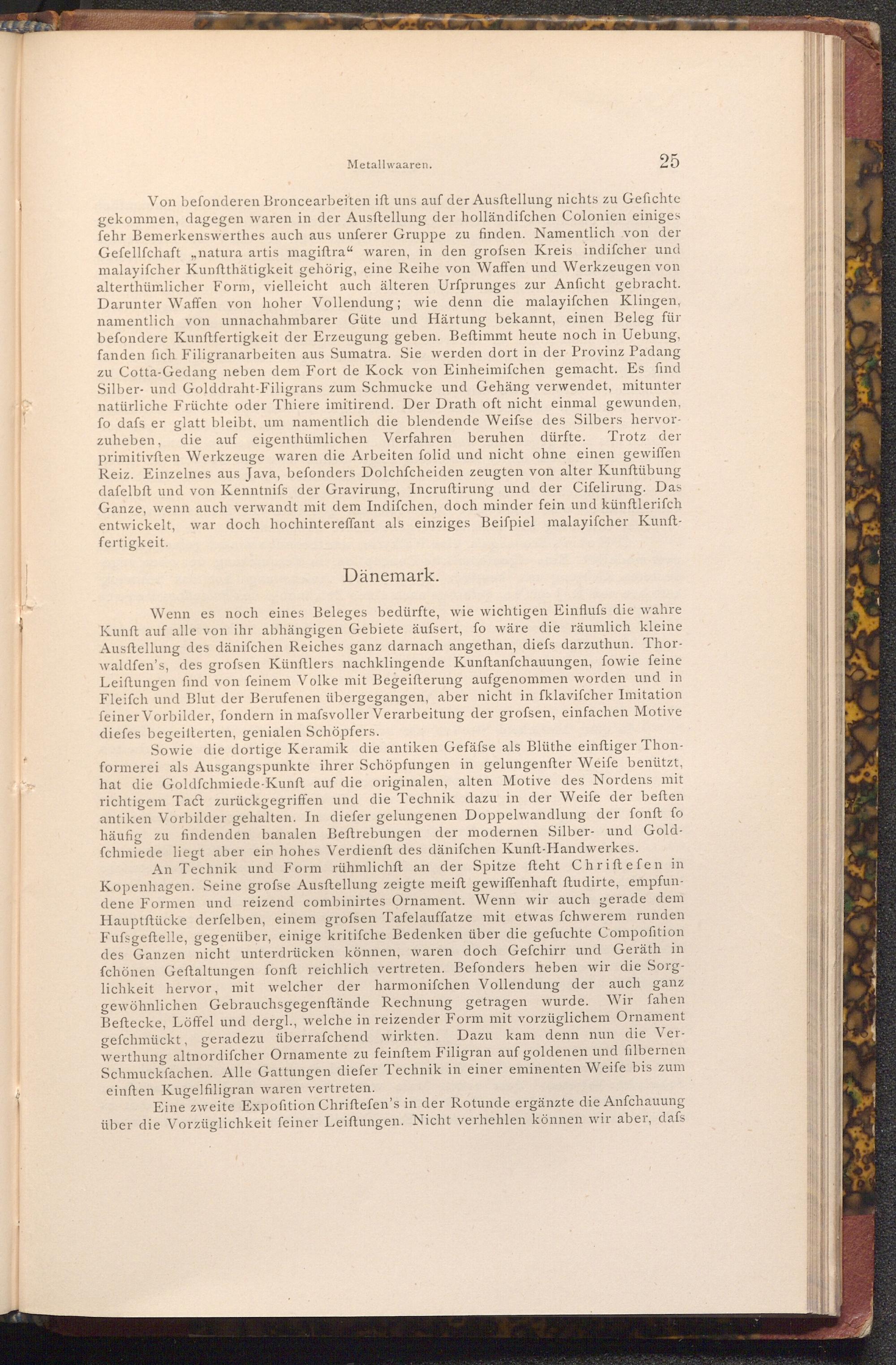 An Technik und Form rühmlichft an der Spitze fteht Chriftefen in Kopenhagen. Seine grofse Ausftellung zeigte meift gewiffenhaft ftudirte, empfundene Formen und reizend combinirtes Ornament. Wenn wir auch gerade dem Hauptftücke derfelben, einem grofsen Tafelauffatze mit etwas fchwerem runden Fufsgeftelle, gegenüber, einige kritifche Bedenken über die gefuchte Compofition des Ganzen nicht unterdrücken können, waren doch Gefchirr und Geräth in fchönen Geftaltungen fonft reichlich vertreten. Befonders heben wir die Sorglichkeit hervor, mit welcher der harmonifchen Vollendung der auch ganz Wir fahen gewöhnlichen Gebrauchsgegenstände Rechnung getragen wurde. Beftecke, Löffel und dergl., welche in reizender Form mit vorzüglichem Ornament gefchmückt, geradezu überrafchend wirkten. Dazu kam denn nun die Verwerthung altnordifcher Ornamente zu feinftem Filigran auf goldenen und filbernen Schmuckfachen. Alle Gattungen diefer Technik in einer eminenten Weife bis zum einften Kugelfiligran waren vertreten.