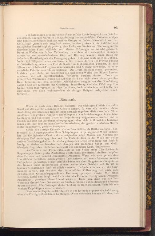 Wenn es noch eines Beleges bedürfte, wie wichtigen Einflufs die wahre Kunft auf alle von ihr abhängigen Gebiete äufsert, fo wäre die räumlich kleine Ausftellung des dänifchen Reiches ganz darnach angethan, diefs darzuthun. Thorwaldfen's, des grofsen Künftlers nachklingende Kunftanfchauungen, fowie feine Leiftungen find von feinem Volke mit Begeisterung aufgenommen worden und in Fleifch und Blut der Berufenen übergegangen, aber nicht in fklavifcher Imitation feiner Vorbilder, fondern in mafsvoller Verarbeitung der grofsen, einfachen Motive diefes begeisterten, genialen Schöpfers.