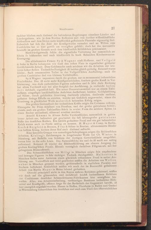 Arnold Kümme in Altona ftellte Verdienftliches, namentlich in getrie bener Arbeit aus, befonders gut gearbeitet die faft lebensgrofse getriebene Büfte des deutfchen Kaifers. Ein hübfch gedachter Pocal und ein gut behandelter Kelch waren auch im Preife mässig zu nennen. H. Meyer& Comp. in Berlin, Koch& Bergfeld in Bremen, Frey& Söhne in Breslau, altrenommirte Häufer von beftem Klang, hielten ihren Ruf auch diefsmal aufrecht.