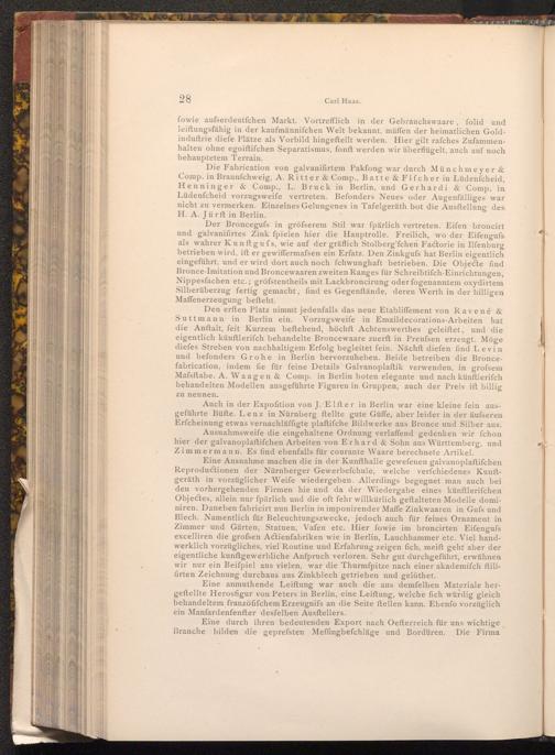 Den erften Platz nimmt jedenfalls das neue Etabliffement von Ravené& Suttmann in Berlin ein. Vorzugsweife in Emaildecorations- Arbeiten hat die Anftalt, feit Kurzem beftehend, höchft Achtenswerthes geleiftet, und die eigentlich künftlerifch behandelte Broncewaare zuerft in Preufsen erzeugt. Möge diefes Streben von nachhaltigem Erfolg begleitet fein. Nächft diefen find Levin und befonders Grohe in Berlin hervorzuheben. Beide betreiben die Broncefabrication, indem fie für feine Details Galvanoplaftik verwenden, in grofsem Mafsftabe. A. Waagen& Comp. in Berlin boten elegante und nach künftlerifch behandelten Modellen ausgeführte Figuren in Gruppen, auch der Preis ift billig.