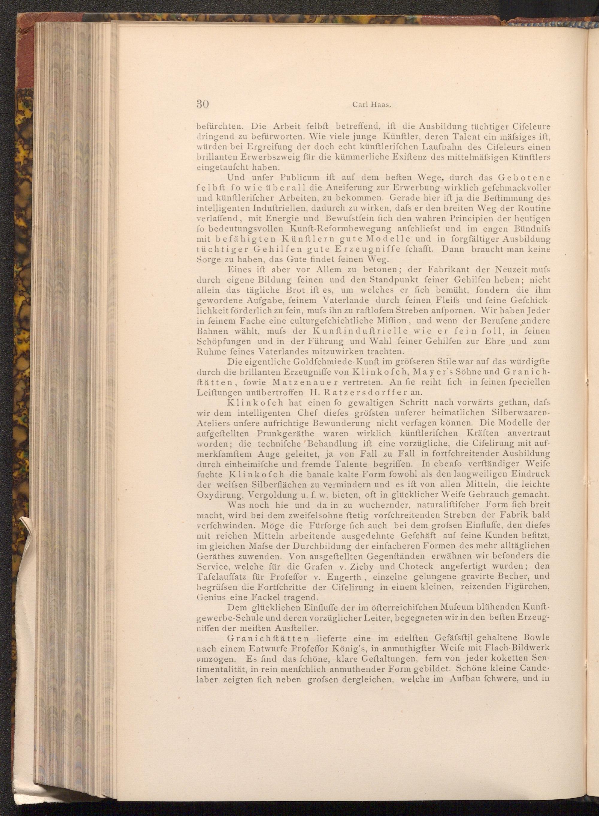 Eines ift aber vor Allem zu betonen; der Fabrikant der Neuzeit mufs durch eigene Bildung feinen und den Standpunkt feiner Gehilfen heben; nicht allein das tägliche Brot ift es, um welches er fich bemüht, fondern die ihm gewordene Aufgabe, feinem Vaterlande durch feinen Fleifs und feine Gefchicklichkeit förderlich zu fein, mufs ihn zu raftlofem Streben anfpornen. Wir haben Jeder in feinem Fache eine culturgefchichtliche Miffion, und wenn der Berufene andere Bahnen wählt, mufs der Kunftinduftrielle wie er fein foll, in feinen Schöpfungen und in der Führung und Wahl feiner Gehilfen zur Ehre und zum Ruhme feines Vaterlandes mitzuwirken trachten.