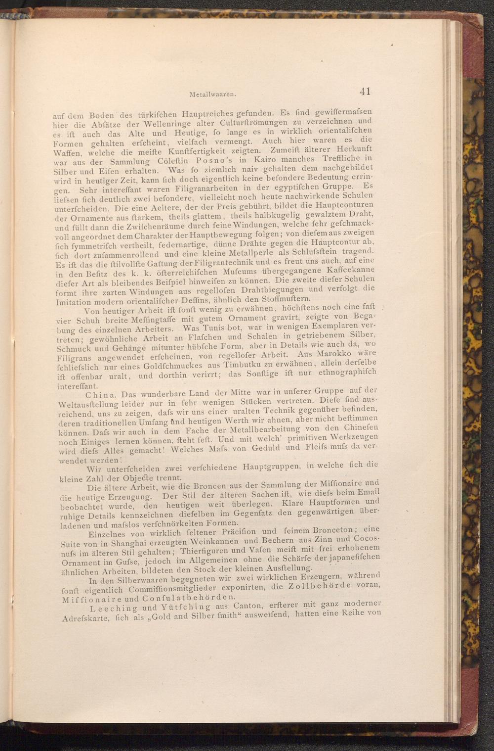 China. Das wunderbare Land der Mitte war in unferer Gruppe auf der Weltausstellung leider nur in fehr wenigen Stücken vertreten. Diefe find ausreichend, uns zu zeigen, dafs wir uns einer uralten Technik gegenüber befinden, deren traditionellen Umfang und heutigen Werth wir ahnen, aber nicht beftimmen können. Dafs wir auch in dem Fache der Metallbearbeitung von den Chinefen noch Einiges lernen können, fteht feft. Und mit welch' primitiven Werkzeugen wird diefs Alles gemacht! Welches Mafs von Geduld und Fleifs mufs da verwendet werden!