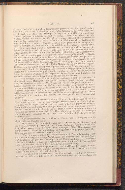 Von heutiger Arbeit ift fonft wenig zu erwähnen, höchftens noch eine faft vier Schuh breite Meffingtaffe mit gutem Ornament gravirt, zeigte von Begabung des einzelnen Arbeiters. Was Tunis bot, war in wenigen Exemplaren vertreten; gewöhnliche Arbeit an Flafchen und Schalen in getriebenem Silber, Schmuck und Gehänge mitunter hübfche Form, aber in Details wie auch da, wo Filigrans angewendet erfcheinen, von regellofer Arbeit. Aus Marokko wäre fchliefslich nur eines Goldfchmuckes aus Timbutku zu erwähnen, allein derfelbe ift offenbar uralt, und dorthin verirrt; das Sonftige ift nur ethnographifch intereffant.