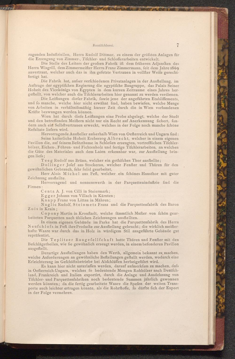 Die Fabrik hat, aufser verfchiedenen Privatanlagen in der Ausftellung, im Auftrage der egyptifchen Regierung die egyptifche Baugruppe, das Palais Seiner Hoheit des Vicekönigs von Egypten in dem kurzen Zeitraume eines Jahres hergeftellt, von welcher auch die Tifchlerarbeiten hier genannt zu werden verdienen. Die Leiftungen diefer Fabrik, fowie jene der angeführten Etabliffements, und fo manche, welche hier nicht erwähnt find, haben bewiefen, welche Menge von Arbeiten in verhältnifsmäfsig kurzer Zeit durch die in Wien vorhandenen Kräfte bezwungen werden können.