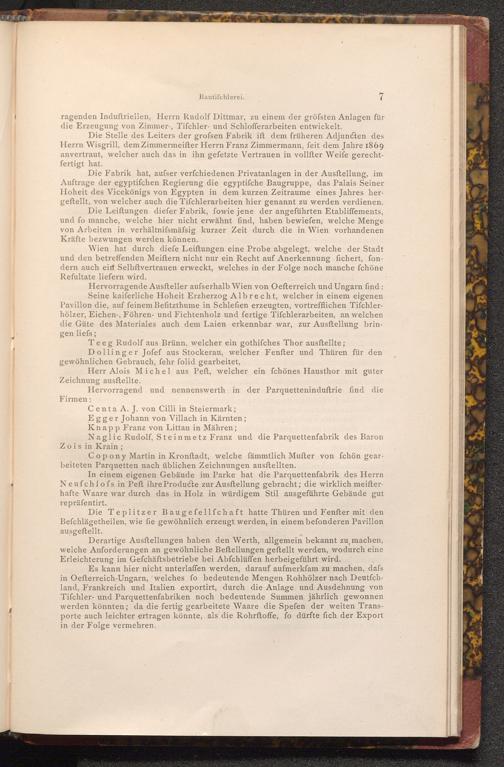 Hervorragende Ausfteller aufserhalb Wien von Oefterreich und Ungarn find: Seine kaiferliche Hoheit Erzherzog Albrecht, welcher in einem eigenen Pavillon die, auf feinem Befitzthume in Schlefien erzeugten, vortrefflichen Tifchlerhölzer, Eichen-, Föhren- und Fichtenholz und fertige Tifchlerarbeiten, an welchen die Güte des Materiales auch dem Laien erkennbar war, zur Ausftellung bringen liefs;