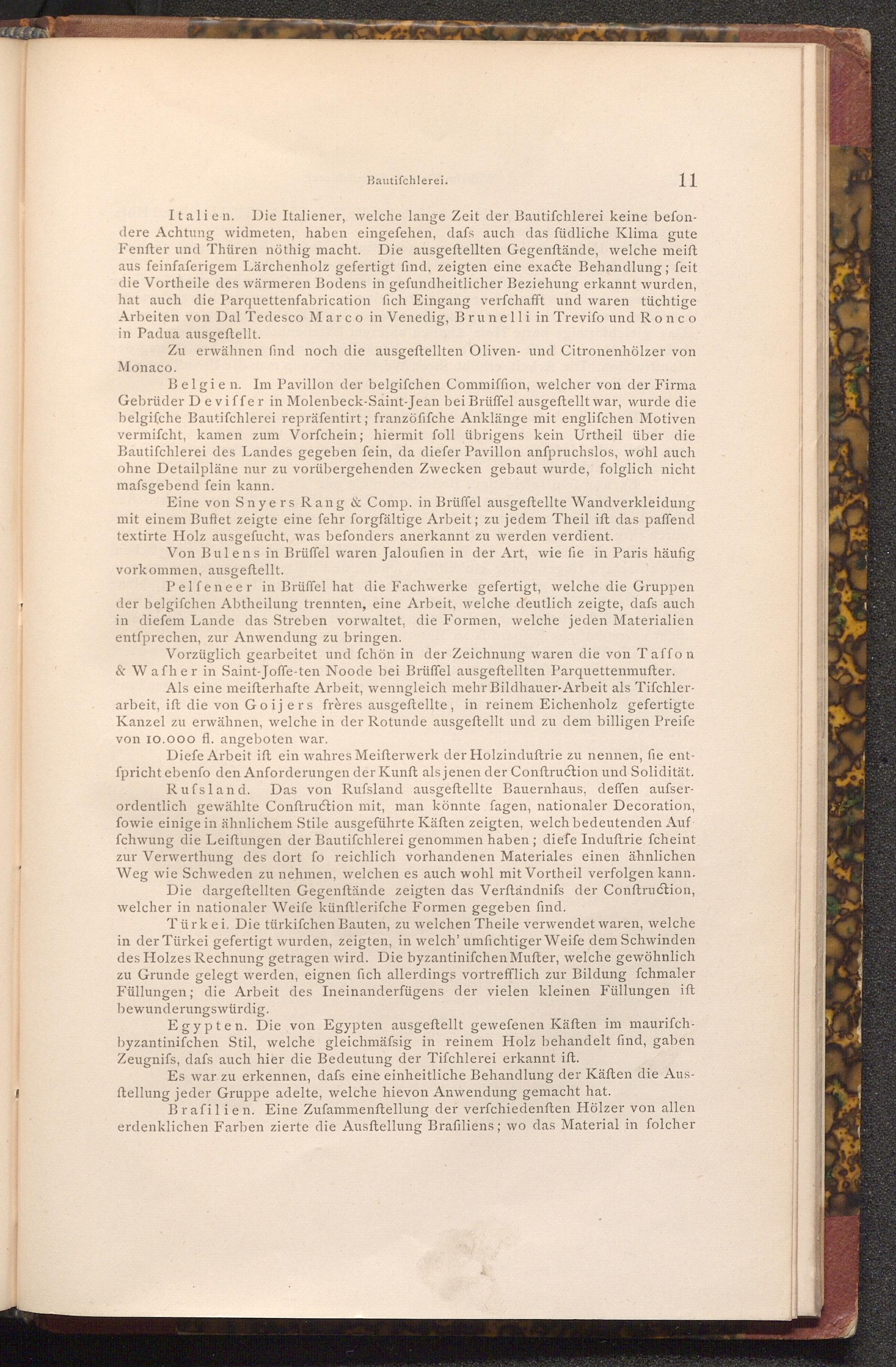 Italien. Die Italiener, welche lange Zeit der Bautifchlerei keine befondere Achtung widmeten, haben eingefehen, dafs auch das füdliche Klima gute Fenfter und Thüren nöthig macht. Die ausgeftellten Gegenftände, welche meift aus feinfaferigem Lärchenholz gefertigt find, zeigten eine exacte Behandlung; feit die Vortheile des wärmeren Bodens in gefundheitlicher Beziehung erkannt wurden, hat auch die Parquettenfabrication fich Eingang verfchafft und waren tüchtige Arbeiten von Dal Tedesco Marco in Venedig, Brunelli in Trevifo und Ronco in Padua ausgeftellt.