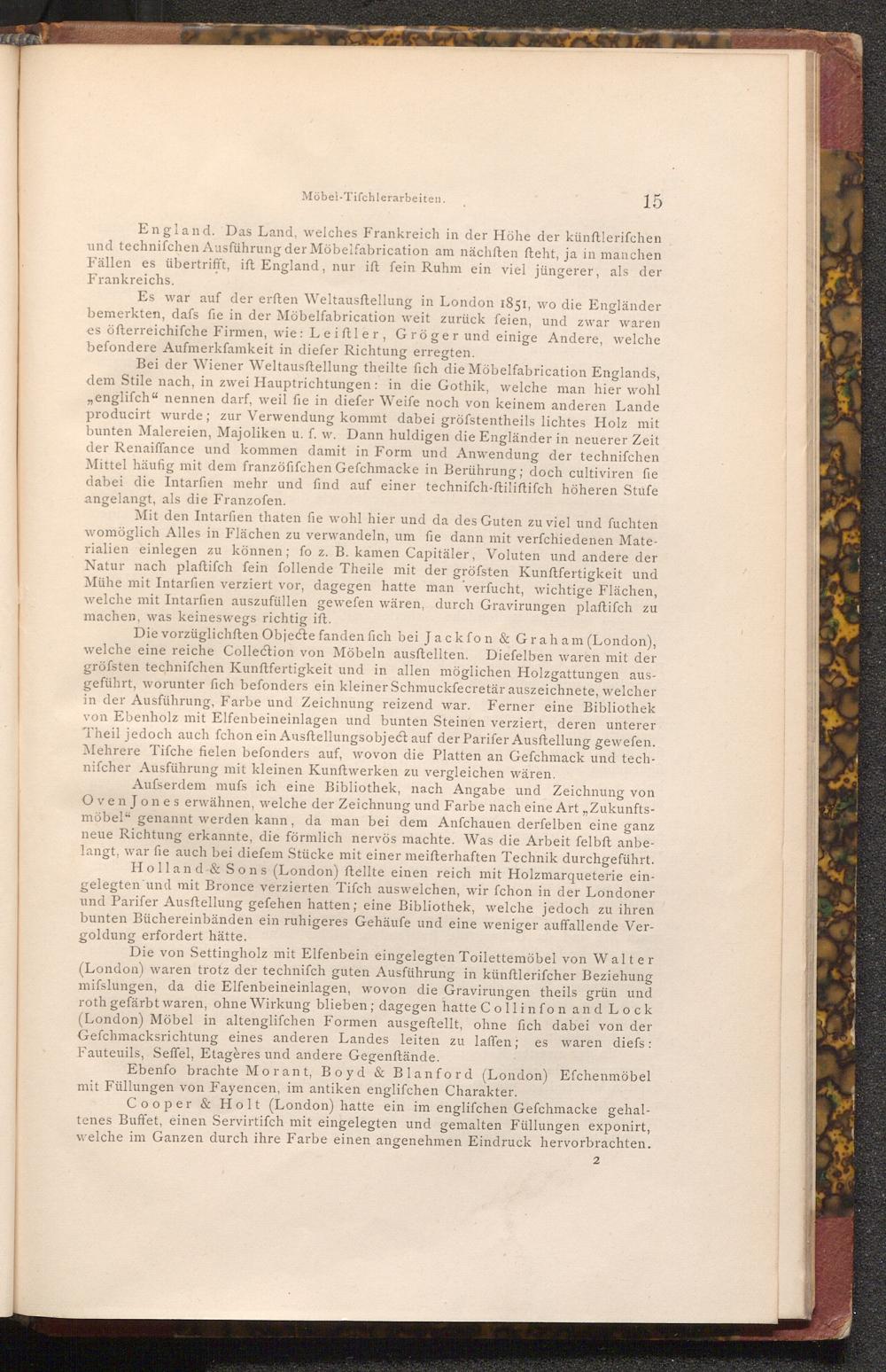 Es war auf der erften Weltausftellung in London 1851, wo die Engländer bemerkten, dafs fie in der Möbelfabrication weit zurück feien, und zwar waren es öfterreichifche Firmen, wie: Leiftler, Gröger und einige Andere, welche befondere Aufmerkfamkeit in diefer Richtung erregten.