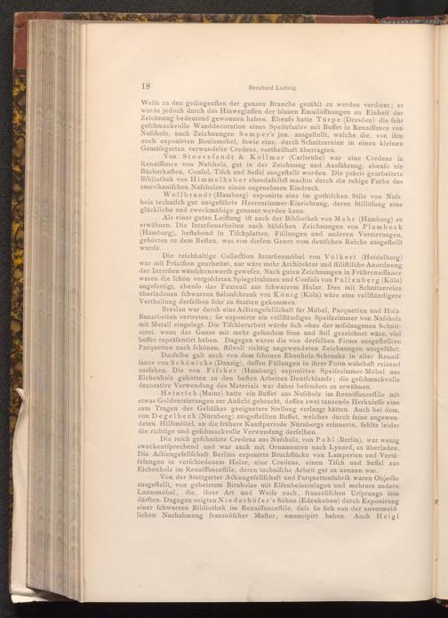 Von Sto evefandt& Kollmar( Carlsruhe) war eine Credenz in Renaiffance von Nufsholz, gut in der Zeichnung und Ausführnng, ebenfo ein Bücherkaften, Confol, Tiſch und Seffel ausgeftellt worden. Die präcis gearbeitete Bibliothek von Himmelheber ebendafelbft machte durch die ruhige Farbe des amerikanifchen Nufsholzes einen angenehmen Eindruck.