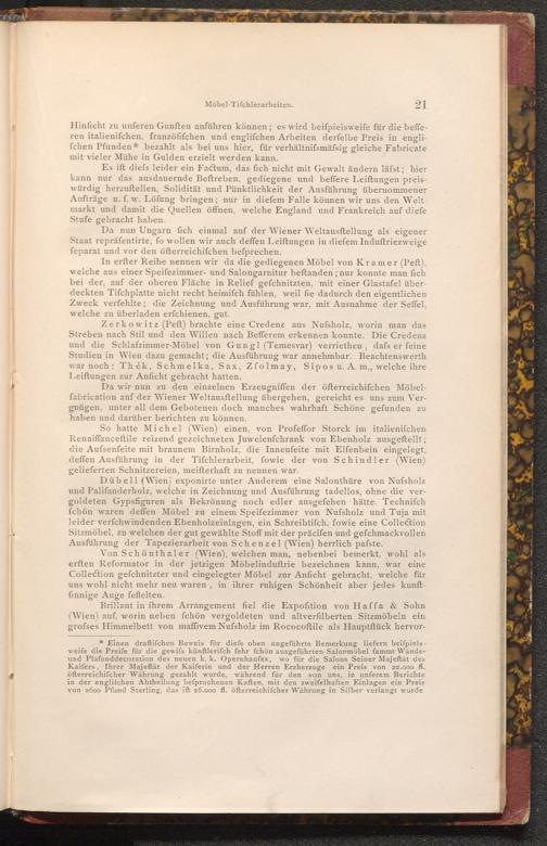 * Einen draftifchen Beweis für diefe oben angeführte Bemerkung liefern beiſpiels- weife die Preife für die gewifs künftlerifch fehr fchön ausgeführten Salonmöbel fammt Wändeund Plafonddecoration des neuen k. k. Opernhaufes, wo für die Salons Seiner Majeftät des Kaifers, Ihrer Majeftät der Kaiferin und der Herren Erzherzoge ein Preis von 22.000 fl. öfterreichiſcher Währung gezahlt wurde, während für den von uns, in unferem Berichte in der englifchen Abtheilung befprochenen Kaften, mit den zweifelhaften Einlagen ein Preis von 2600 Pfund Sterling, das ift 26.000 fl. öfterreichiſcher Währung in Silber verlangt wurde