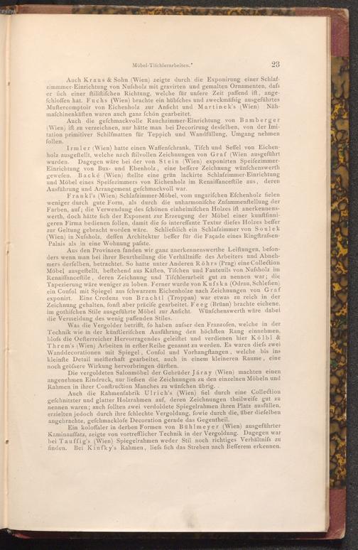 Auch Kraus& Sohn( Wien) zeigte durch die Exponirung einer Schlafzimmmer- Einrichtung von Nufsholz mit gravirten und gemalten Ornamenten, dafs er fich einer ftiliftifchen Richtung, welche für unfere Zeit paffend ift, angefchloffen hat. Fuchs( Wien) brachte ein hübfches und zweckmäfsig ausgeführtes Muftercomptoir von Eichenholz zur Anficht und Martinek's( Wien) Nähmafchinenkäften waren auch ganz fchön gearbeitet.