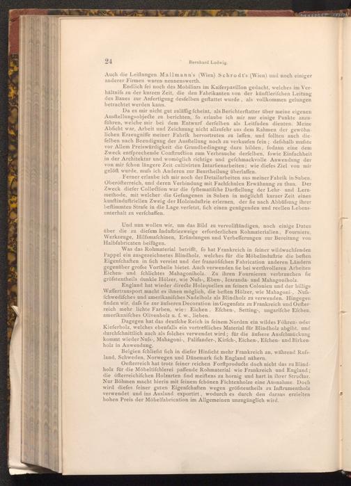 Ferner erlaube ich mir noch der Detail arbeiten aus meiner Fabrik in Suben, Oberöfterreich, und deren Verbindung mit Fachſchulen Erwähnung zu thun. Der Zweck diefer Collection war die fyftematifche Darftellung der Lehr- und Lernmethode, mit welcher die Gefangenen in Suben in möglichft kurzer Zeit einen kunftinduftriellen Zweig der Holzinduftrie erlernen, der fie nach Abbüfsung ihrer beftimmten Strafe in die Lage verfetzt, fich einen genügenden und reellen Lebensunterhalt zu verfchaffen.