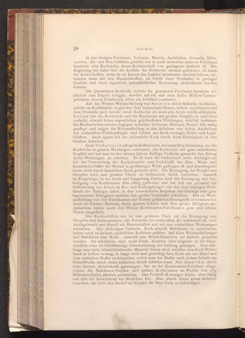 Auf der Wiener Weltausftellung war Spanien durch fünfzehn Ausfteller, welche im Korkhandel zu gleicher Zeit bedeutende Namen haben, repräfentirt und dem Producte nach fowohl durch Rohkorke als auch alle Arten von Korkftöpfeln. Italien hat die Korkzucht und die Korkeiche mit grofser Sorgfalt zu cultiviren verfucht, obwohl keine eigentlichen gefchloffenen Waldungen dafelbft beftehen. Die Korkarbeiten werden dagegen in Italien: in Genua, Mailand, Neapel fehr emfig gepflegt und zeigte die Weltausftellung in den Arbeiten von fieben Ausftellern den einfachften Flafchenftöpfel und fchöne aus Kork erzeugte Bilder und Land-, fchaften. Auch eignet fich der italienifche Kork durch feine Dichtigkeit zu den feinften Arbeiten.