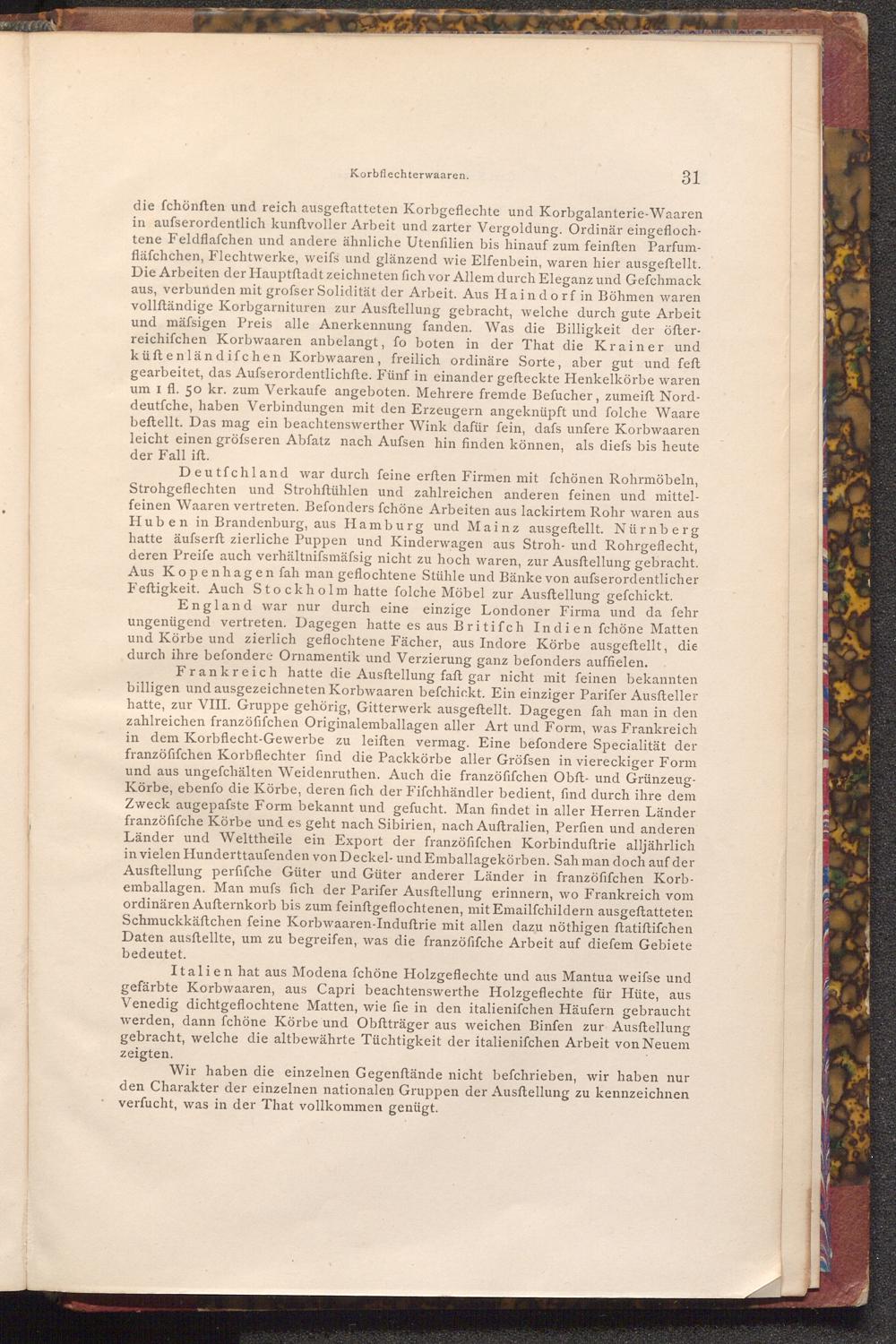 Italien hat aus Modena fchöne Holzgeflechte und aus Mantua weifse und gefärbte Korbwaaren, aus Capri beachtenswerthe Holzgeflechte für Hüte, aus Venedig dichtgeflochtene Matten, wie fie in den italienifchen Häufern gebraucht werden, dann fchöne Körbe und Obftträger aus weichen Binfen zur Ausstellung gebracht, welche die altbewährte Tüchtigkeit der italienifchen Arbeit von Neuem zeigten.