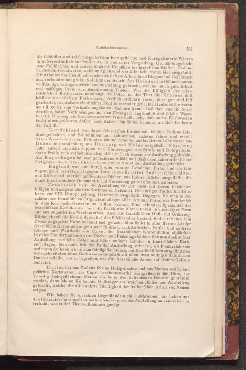 Deutfchland war durch feine erften Firmen mit fchönen Rohrmöbeln, Strohgeflechten und Strohftühlen und zahlreichen anderen feinen und mittelfeinen Waaren vertreten. Befonders fchöne Arbeiten aus lackirtem Rohr waren aus Huben in Brandenburg, aus Hamburg und Mainz ausgeftellt. Nürnberg hatte äufserft zierliche Puppen und Kinderwagen aus Stroh- und Rohrgeflecht, deren Preife auch verhältnifsmäfsig nicht zu hoch waren, zur Ausftellung gebracht. Aus Kopenhagen fah man geflochtene Stühle und Bänke von aufserordentlicher Feftigkeit. Auch Stockholm hatte folche Möbel zur Ausftellung gefchickt.