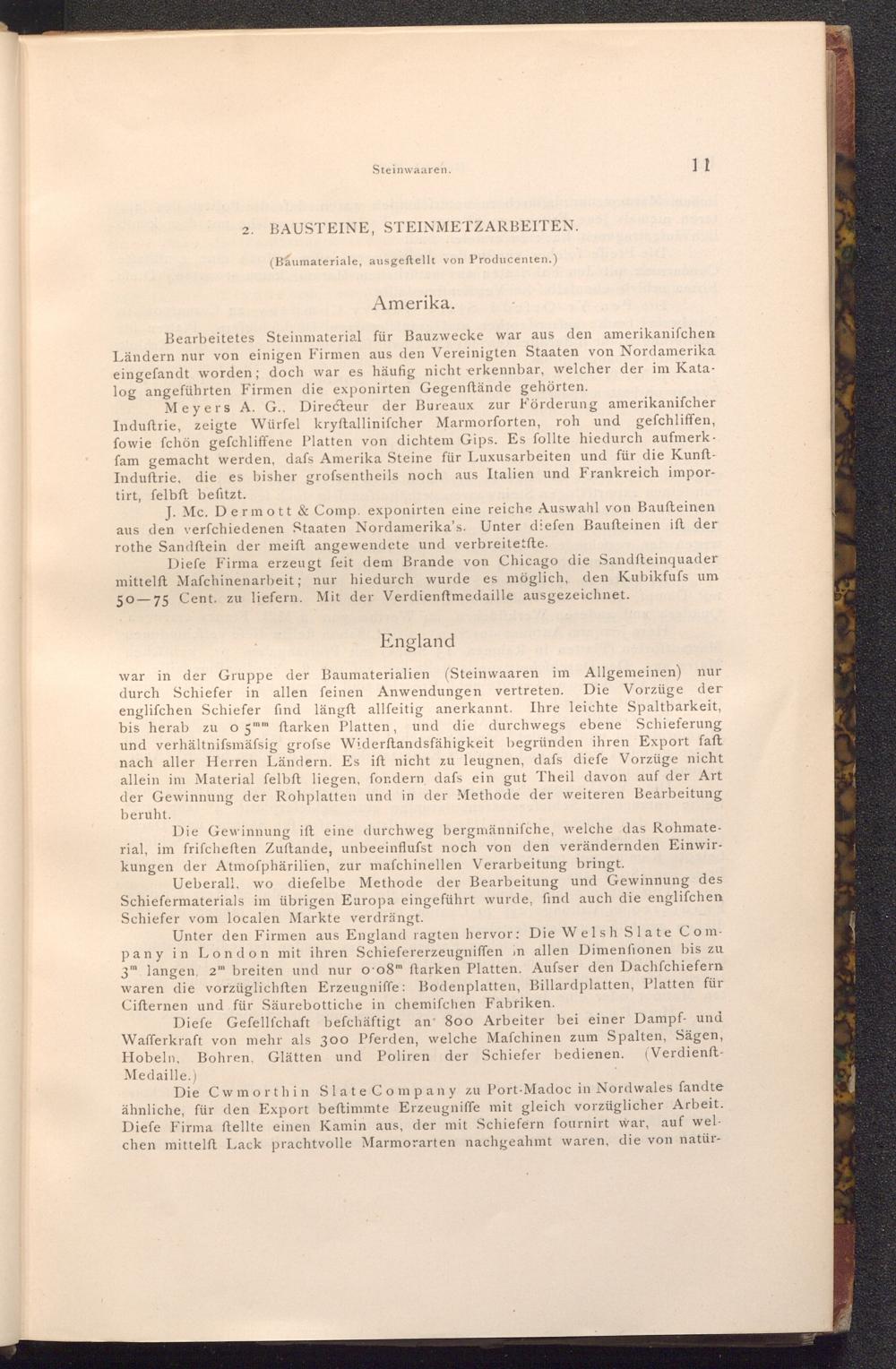 Unter den Firmen aus England ragten hervor: Die Welsh Slate Com pany in London mit ihren Schiefererzeugniffen in allen Dimenfionen bis zu 3 langen, 2 breiten und nur o 08m ftarken Platten. Aufser den Dachfchiefern waren die vorzüglichften Erzeugniffe: Bodenplatten, Billardplatten, Platten für Cifternen und für Säurebottiche in chemifchen Fabriken.