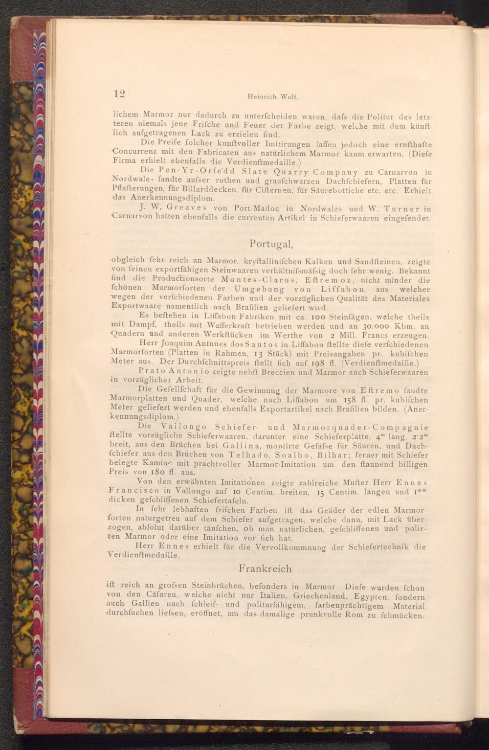 Es beftehen in Liffabon Fabriken mit ca. 100 Steinfägen, welche theils mit Dampf, theils mit Wafferkraft betrieben werden und an 30.000 Kbm. an Quadern und anderen Werkftücken im Werthe von 2 Mill. Francs erzeugen.. Herr Joaquim Antunes dos Santos in Liffabon ftellte diefe verfchiedenen Marmorforten( Platten in Rahmen, 13 Stück) mit Preisangaben pr. kubifchen Meter aus. Der Durchfchnittspreis ftellt fich auf 198 fl.( Verdienftmedaille.)