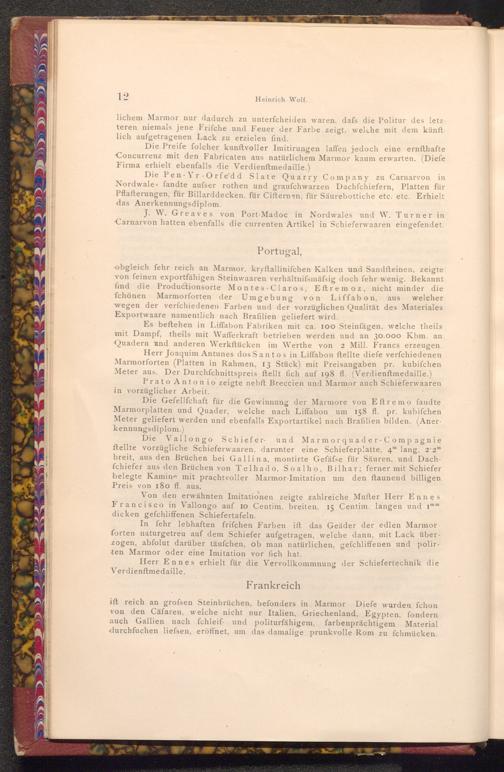 Die Vallongo Schiefer- und und Marmor quader- Compagnie ftellte vorzügliche Schieferwaaren, darunter eine Schieferplatte, 4" lang, 2.2™ breit, aus den Brüchen bei Gallina, montirte Gefäfse für Säuren, und Dachfchiefer aus den Brüchen von Telhado, Soalho, Bilhar; ferner mit Schiefer belegte Kamine mit prachtvoller Marmor- Imitation um den ftaunend billigen Preis von 180 fl. aus.