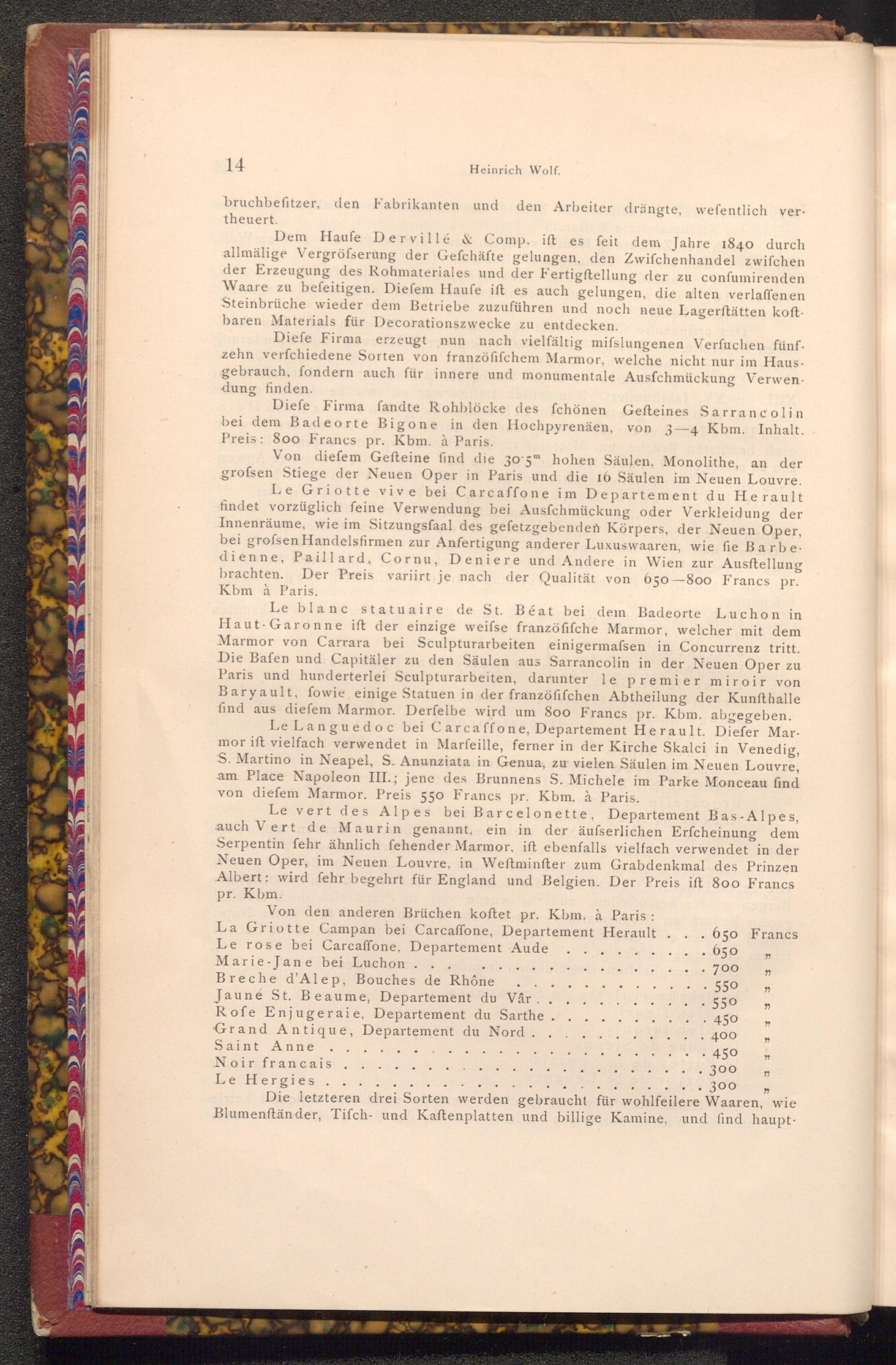 Von den anderen Brüchen koftet pr. Kbm. à Paris: La Griotte Campan bei Carcaffone, Departement Herault. Le rose bei Carcaffone, Departement Aude Marie- Jane bei Luchon.