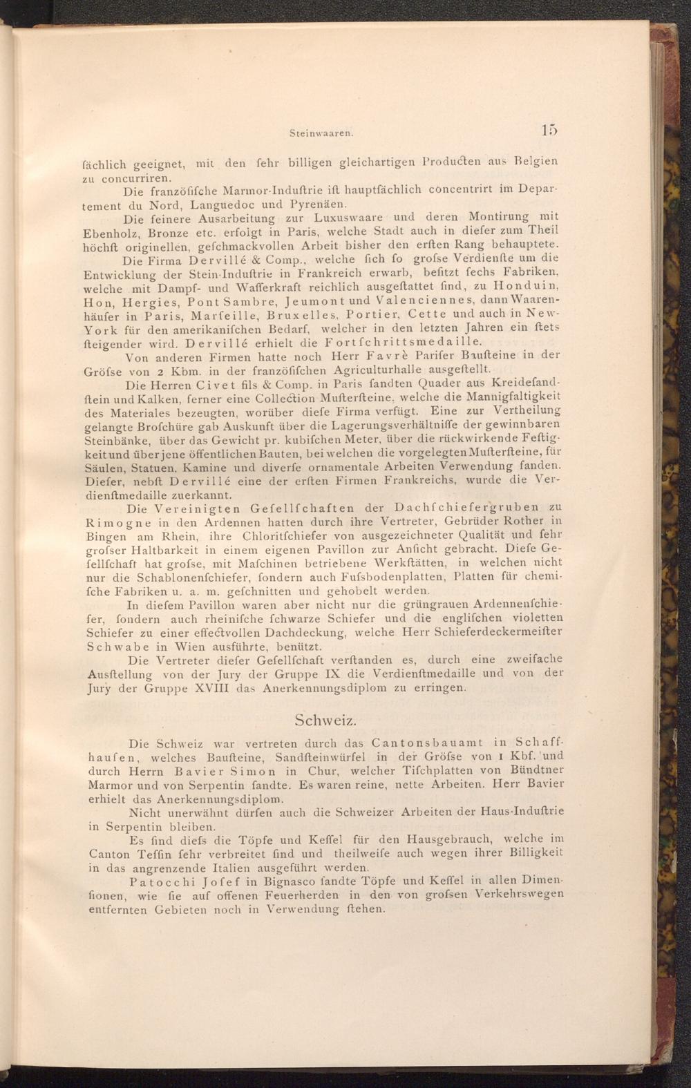 Die Vereinigten Gefellfchaften der Dachfchiefergruben zu Rimogne in den Ardennen hatten durch ihre Vertreter, Gebrüder Rother in Bingen am Rhein, ihre Chloritfchiefer von ausgezeichneter Qualität und fehr grofser Haltbarkeit in einem eigenen Pavillon zur Anficht gebracht. Diefe Gefellfchaft hat grofse, mit Mafchinen betriebene Werkstätten, in welchen nicht nur die Schablonenfchiefer, fondern auch Fufsbodenplatten, Platten für chemifche Fabriken u. a. m. gefchnitten und gehobelt werden.