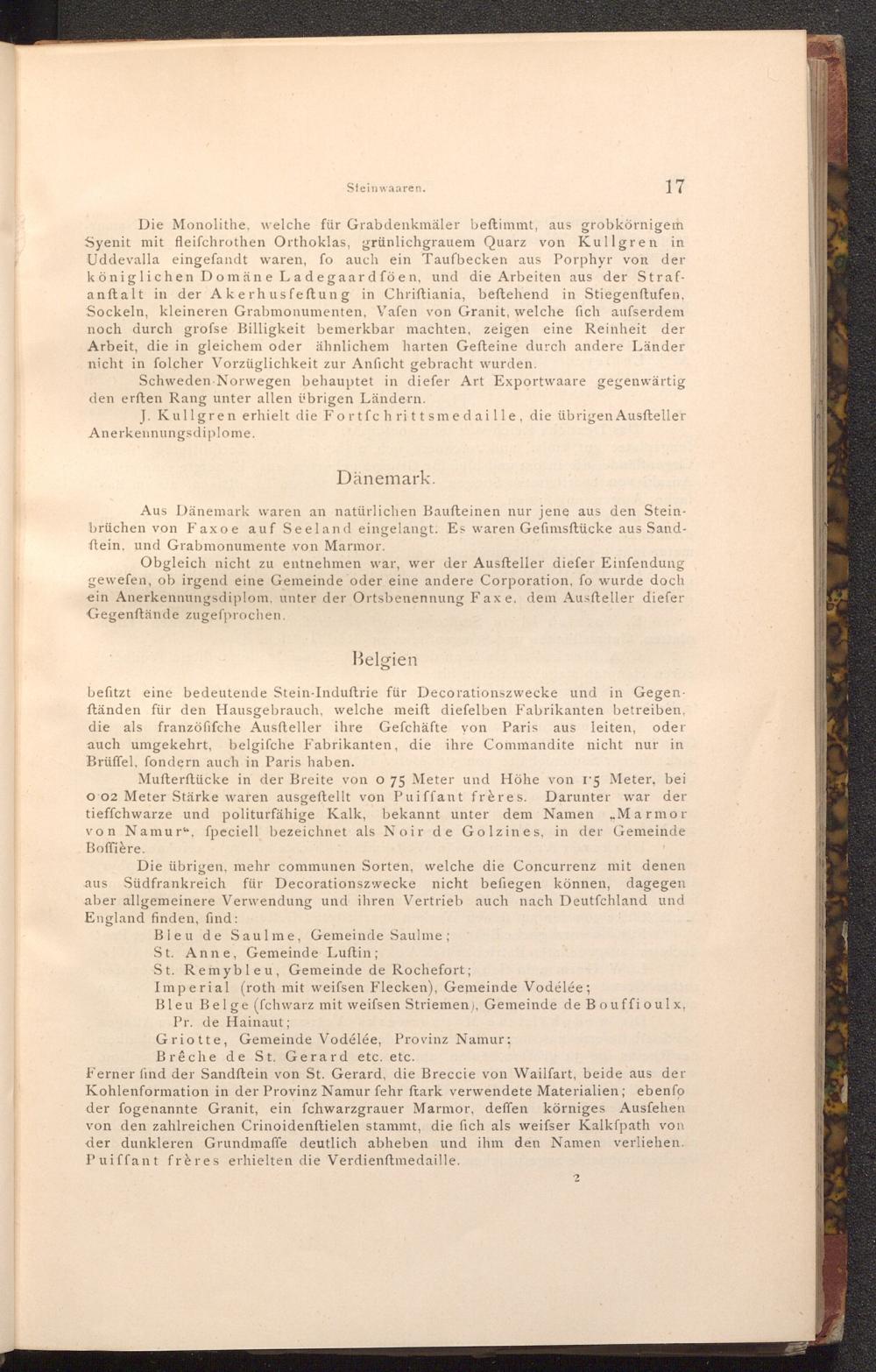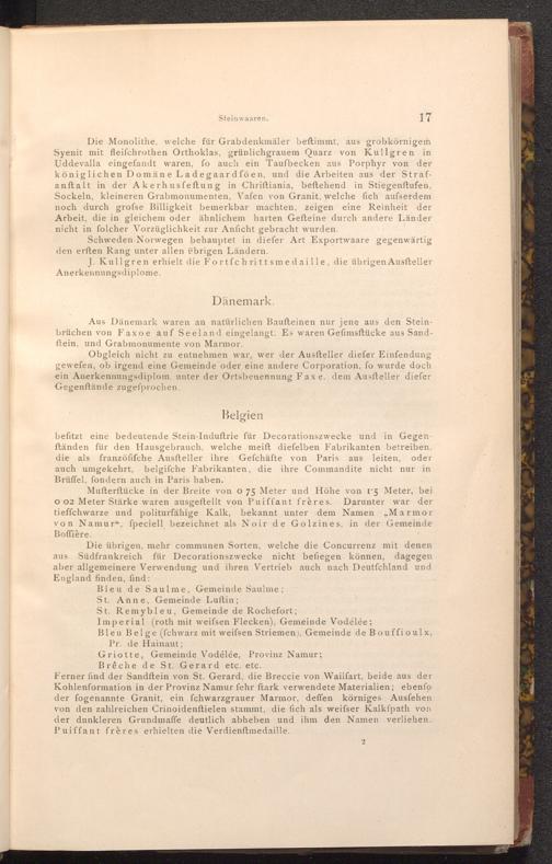 Ferner find der Sandftein von St. Gerard, die Breccie von Wailfart, beide aus der Kohlenformation in der Provinz Namur fehr ftark verwendete Materialien; ebenfo der fogenannte Granit, ein fchwarzgrauer Marmor, deffen körniges Ausfehen von den zahlreichen Crinoidenftielen stammt, die fich als weifser Kalkfpath von der dunkleren Grundmaffe deutlich abheben und ihm den Namen verliehen. Puiffant frères erhielten die Verdienftmedaille.