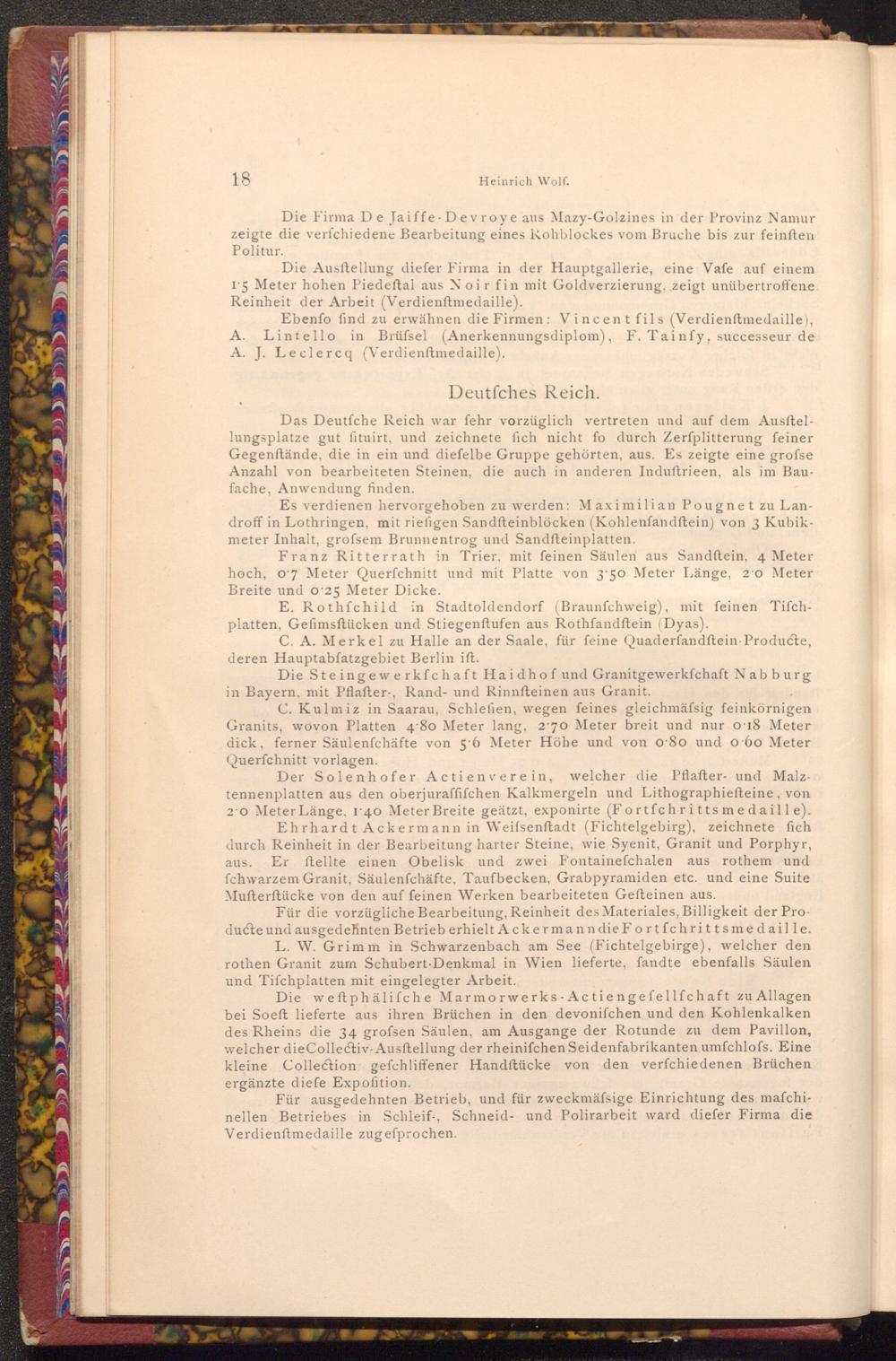 Der Solenhofer Actienverein, welcher die Pflafter- und Malztennenplatten aus den oberjuraffifchen Kalkmergeln und Lithographiefteine, von 20 Meter Länge, 1'40 Meter Breite geätzt, exponirte( Fortfchritts medaille). Ehrhardt Ackermann in Weifsenftadt( Fichtelgebirg), zeichnete fich durch Reinheit in der Bearbeitung harter Steine, wie Syenit, Granit und Porphyr, aus. Er ftellte einen Obelisk und zwei Fontainefchalen aus rothem und fchwarzem Granit, Säulenfchäfte, Taufbecken, Grabpyramiden etc. und eine Suite Mufterſtücke von den auf feinen Werken bearbeiteten Gefteinen aus.