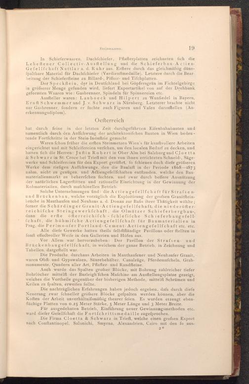 Waren fchon früher die erften Steinmetzen Wien's für kunftvollere Arbeiten eingerichtet und mit Schleifereien verfehen, um den localen Bedarf zu decken, und hatten fich die Herren: Juftin Robert in Ober Alm bei Salzburg und Cloetta & Schwarz in St. Croce bei Trieft mit den von ihnen errichteten Schneid-, Sägewerke und Schleifereien für den Export gerüftet, fo fchienen doch diefe gröfseren Werke dem riefigen Auffchwunge, den die Bauluft in der Periode 1868-1873 nahm, nicht zu genügen, und Actiengeſellſchaften entftanden, welche den Baumaterialienmarkt zu beherrfchen fuchten, und zwar durch beffere Ausnützung der natürlichen Lagerftätten und rationelle Einrichtung in der Gewinnung der Rohmaterialien, durch mafchinellen Betrieb.