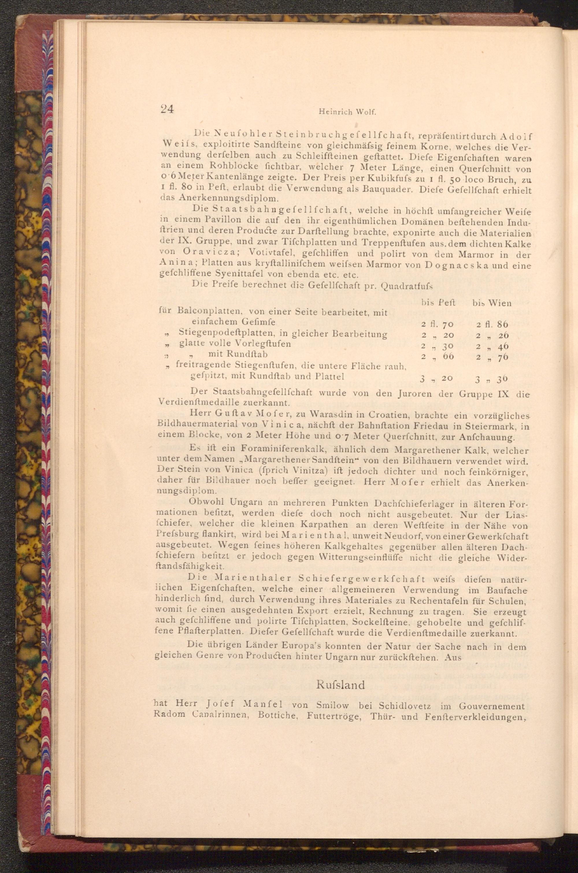 Die Neufohler Steinbruchgefellfchaft, repräfentirt durch Adolf Weiís, exploitirte Sandſteine von gleichmäfsig feinem Korne, welches die Verwendung derfelben auch zu Schleiffteinen geftattet. Diefe Eigenfchaften waren an einem Rohblocke fichtbar, welcher 7 Meter Länge, einen Querfchnitt von o 6 Meter Kantenlänge zeigte. Der Preis per Kubikfufs zu 1 fl. 50 loco Bruch, zu I fl. 80 in Peft, erlaubt die Verwendung als Bauquader. Diefe Gefellſchaft erhielt das Anerkennungsdiplom.