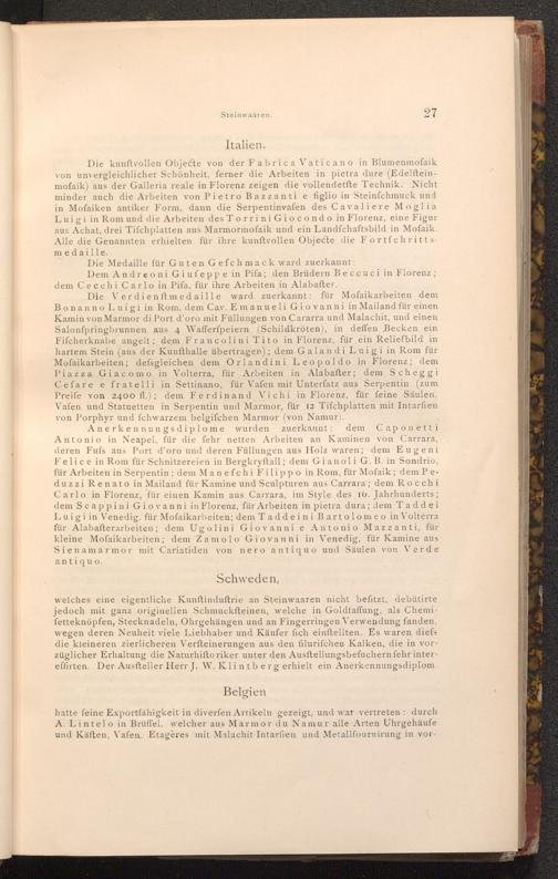 Anerkennungsdiplome wurden zuerkannt: dem Caponetti Antonio in Neapel, für die fehr netten Arbeiten an Kaminen von Carrara, deren Fufs aus Port d'oro und deren Füllungen aus Holz waren; dem Eugeni Felice in Rom für Schnitzereien in Bergkryftall; dem Gianoli G. B. in Sondrio, für Arbeiten in Serpentin; dem Manefchi Filippo in Rom, für Mofaik; dem Peduzzi Renato in Mailand für Kamine und Sculpturen aus Carrara; dem Rocchi Carlo in Florenz, für einen Kamin aus Carrara, im Style des 16. Jahrhunderts; dem Scappini Giovanni in Florenz, für Arbeiten in pietra dura; dem Taddei Luigi in Venedig. für Mofaikarbeiten; dem Taddeini Bartolomeo in Volterra für Alabafterarbeiten; dem Ugolini Giovanni e Antonio Mazzanti, für kleine Mofaikarbeiten; dem Zamolo Giovanni in Venedig, für Kamine aus Sienamarmor mit Cariatiden von nero antiquo und Säulen von Verde antiquo.