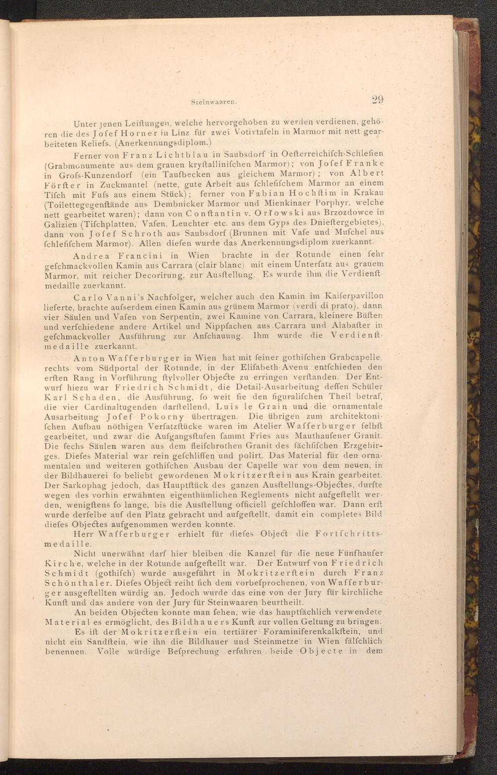 Ferner von Franz Lichtblau in Saubsdorf in Oefterreichiſch- Schlefien ( Grabmonumente aus dem grauen kryftallinifchen Marmor); von Jofef Franke in Grofs- Kunzendorf( ein Taufbecken aus gleichem Marmor); von Albert Förfter in Zuckmantel( nette, gute Arbeit aus fchlefifchem Marmor an einem Tifch mit Fufs aus einem Stück); ferner von Fabian Hochftim in Krakau ( Toilettegegenftände aus Dembnicker Marmor und Mienkinaer Porphyr, welche nett gearbeitet waren); dann von Conftantin v. Orlowski aus Brzozdowce in Galizien( Tifchplatten, Vafen, Leuchter etc. aus dem Gyps des Dnieftergebietes) ,, dann von Jofef Schroth aus Saubsdorf( Brunnen mit Vafe und Mufchel aus fchlefifchem Marmor). Allen diefen wurde das Anerkennungsdiplom zuerkannt.