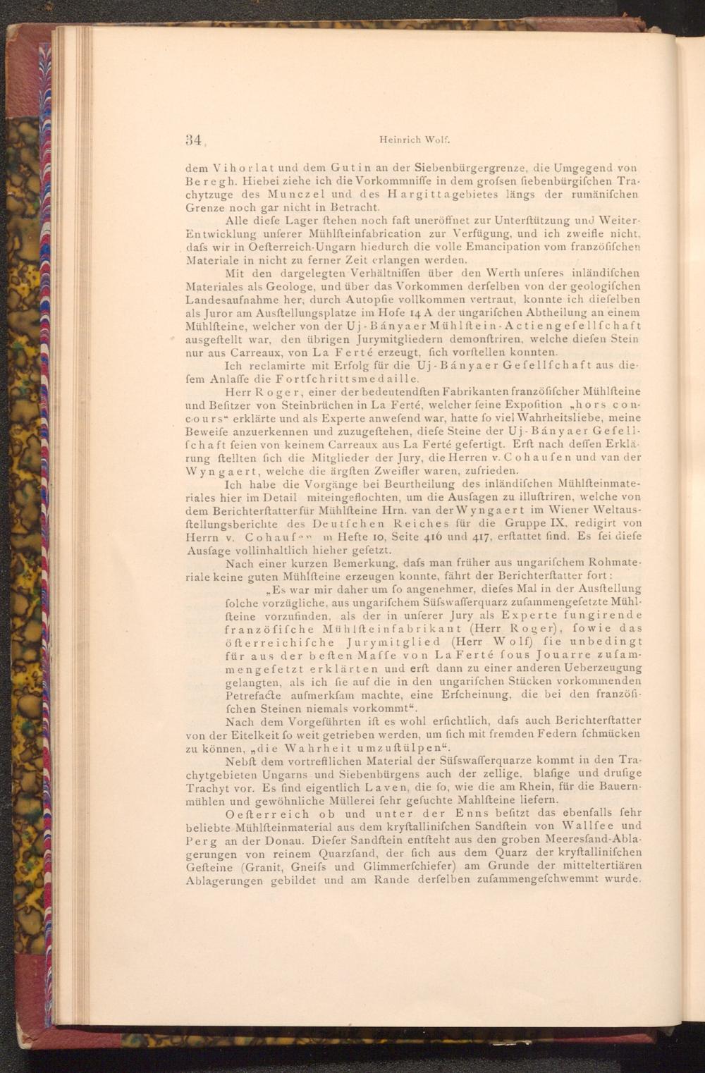 Mit den dargelegten Verhältniffen über den Werth unferes inländifchen Materiales als Geologe, und über das Vorkommen derfelben von der geologifchen Landesaufnahme her; durch Autopfie vollkommen vertraut, konnte ich diefelben als Juror am Ausftellungsplatze im Hofe 14 A der ungarifchen Abtheilung an einem Mühlfteine, welcher von der Uj- Bánya er Mühlftein Actiengefellfchaft ausgeftellt war, den übrigen Jurymitgliedern demonftriren, welche diefen Stein nur aus Carreaux, von La Ferté erzeugt, fich vorftellen konnten.