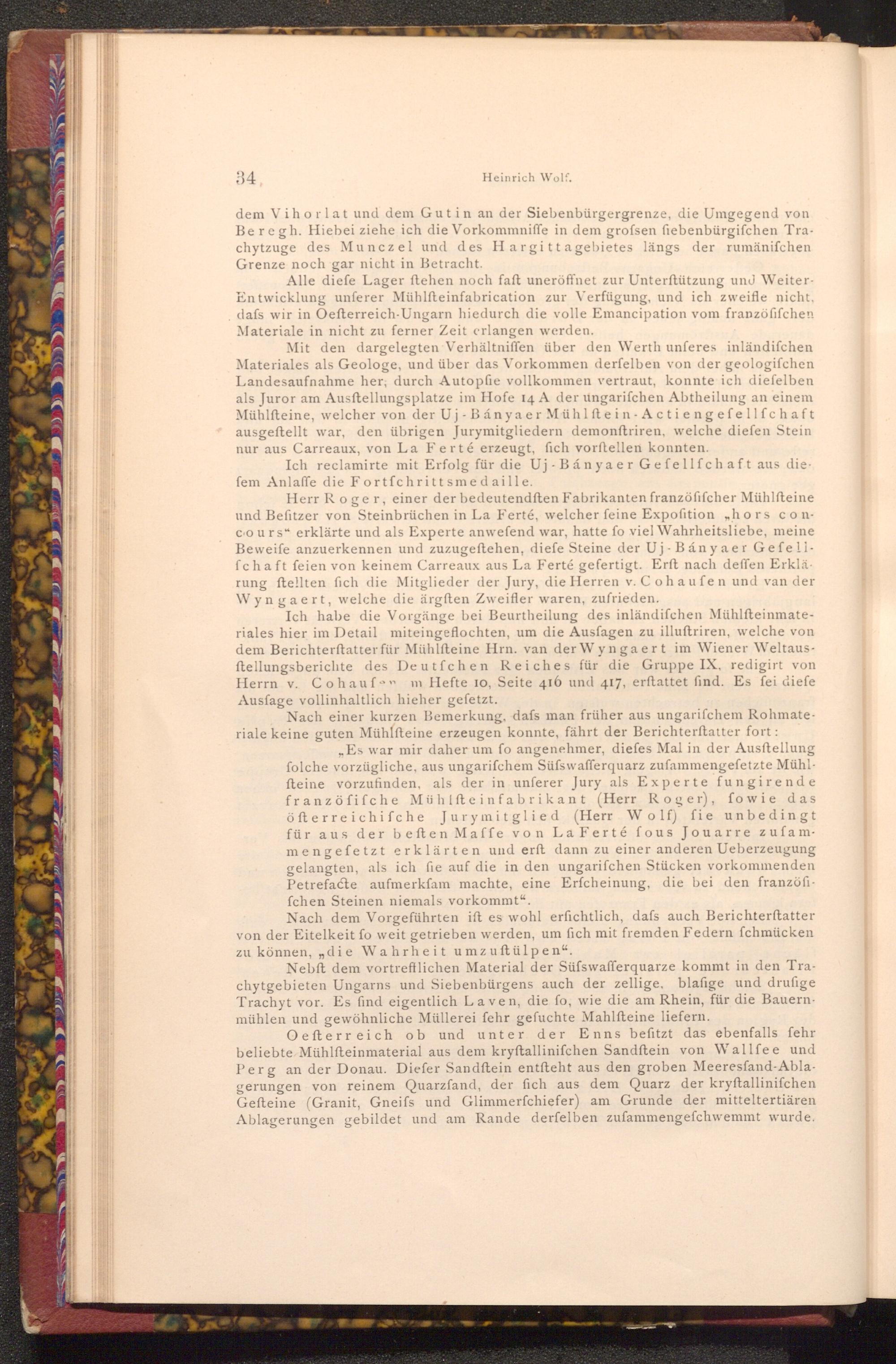 ,, Es war mir daher um fo angenehmer, diefes Mal in der Ausstellung folche vorzügliche, aus ungarifchem Süfswafferquarz zufammengefetzte Mühlfteine vorzufinden, als der in unferer Jury als Experte fungirende franzöfifche Mühlfteinfabrikant( Herr Roger), fowie das öfterreichifche Jurymitglied( Herr Wolf) fie unbedingt für aus der beften Maffe von La Ferté fous Jouarre zufammengefetzt erklärten und erft dann zu einer anderen Ueberzeugung gelangten, als ich fie auf die in den ungarifchen Stücken vorkommenden Petrefacte aufmerkfam machte, eine Erfcheinung, die bei den franzöfifchen Steinen niemals vorkommt".
