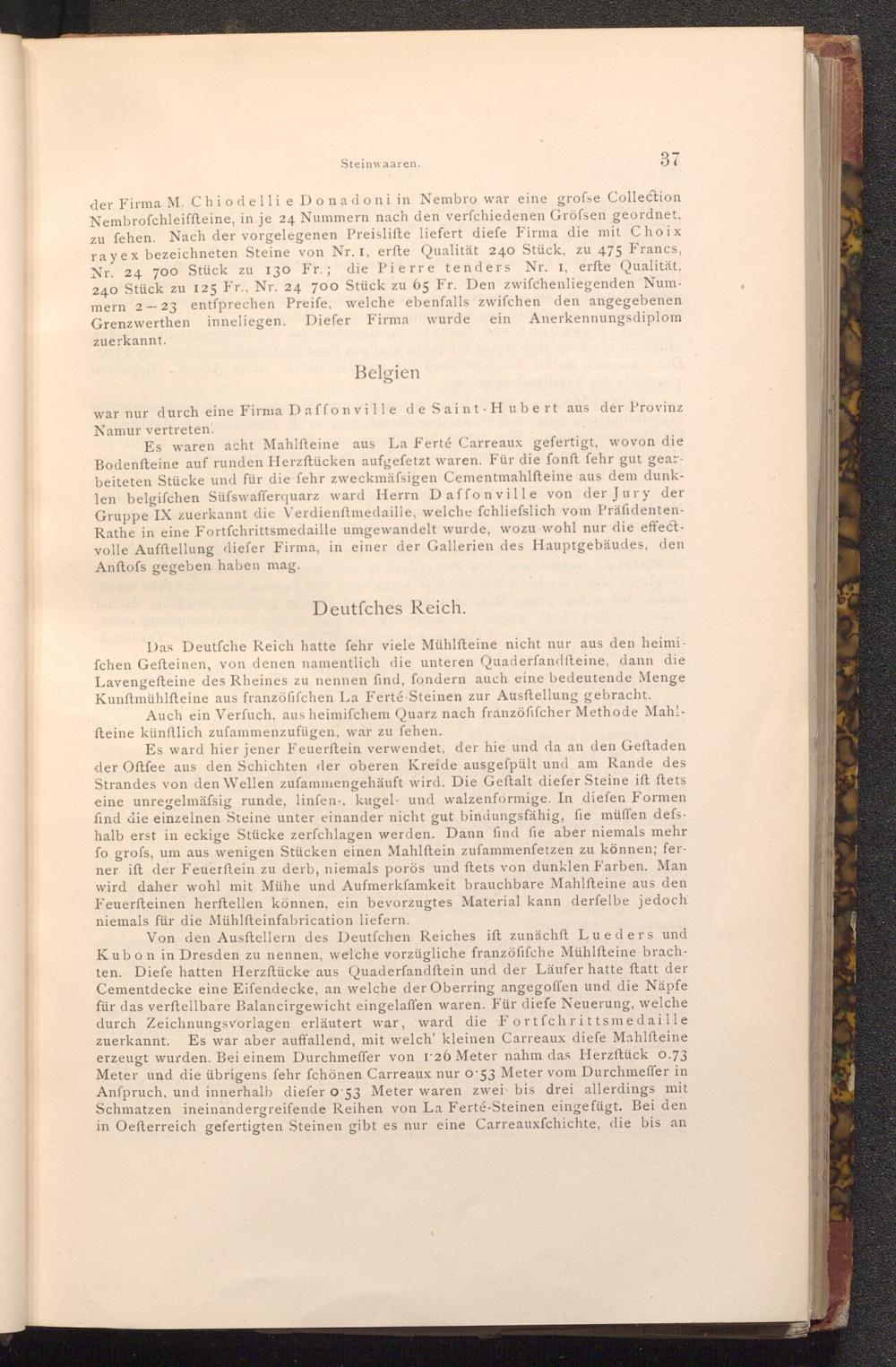 Es waren acht Mahlfteine aus La Ferté Carreaux gefertigt, wovon die Bodenfteine auf runden Herzftücken aufgefetzt waren. Für die fonft fehr gut gearbeiteten Stücke und für die fehr zweckmäfsigen Cementmahlfteine aus dem dunklen belgifchen Süfswafferquarz ward Herrn Daffonville von der Jury der Gruppe IX zuerkannt die Verdienftmedaille, welche fchliefslich vom PräfidentenRathe in eine Fortfchrittsmedaille umgewandelt wurde, wozu wohl nur die effect. volle Aufftellung diefer Firma, in einer der Gallerien des Hauptgebäudes, den Anftofs gegeben haben mag.