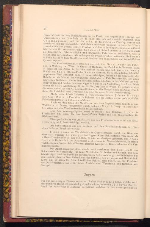 Firma Mitbefitzer von Steinbrüchen in La Ferté, von ungarifchen Trachyt- und Quarzbrüchen am Granfluffe bei Hlinik( flavifch und deutfch, ungarisch aber Geletnek genannt) und bei Szlaska. In der Fabrik zu Penzing werden faft ausfchliesslich nur franzöfifche Mahlfteine verfertigt, während in jener bei Hlinik vornehmlich der poröfe, zellige Trachyt, welcher in der ungarifchen Landmüllerei fehr beliebt ift, verarbeitet wird. Schwartz& Sohn konnten in der Eigenfchaft als franzöfifche, öfterreichiſche und ungarifche Fabrikanten erfcheinen, und in diefen drei verfchiedenen Abtheilungen als Preisbewerber auftreten. Schwartz & Sohn hatten 6 Paar Mahlfteine und Proben von ungarifchem und franzöfifchem Quarze exponirt.
