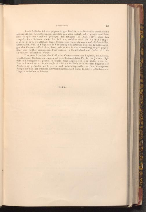 Somit fchliefse ich den gegenwärtigen Bericht, der fo vielfach durch meine anderweitigen Befchäftigungen auswärts von Wien unterbrochen wurde, und defshalb fo fpät zum Abfchlufs gelangte. Ich fchliefse ihn( April 1877), ohne den vorgefteckten Rahmen diefes Berichtes, welcher auch die Verbindungsmaterialien, wie Afphalt, Gyps, Cement und Cementwaaren umfchliefsen follte, auszufüllen, weil in Folge diefer Verfpätung ein getreues Bild des Induftriezwei ges der Cement Fabrication, wie es fich in der Ausftellung zeigte, gegenüber den feither errungenen Fortfchritten in Deutſchland und Oefterreich als zu veraltet erfcheinen würde.