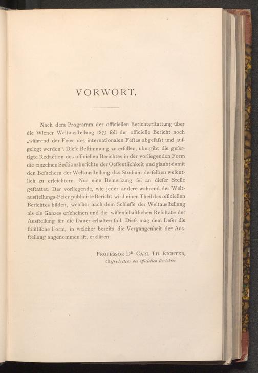 Nach dem Programm der officiellen Berichterstattung über die Wiener Weltausstellung 1873 foll der officielle Bericht noch ,, während der Feier des internationalen Feftes abgefafst und aufgelegt werden". Diefe Beftimmung zu erfüllen, übergibt die gefertigte Redaction des officiellen Berichtes in der vorliegenden Form die einzelnen Sectionsberichte der Oeffentlichkeit und glaubt damit den Befuchern der Weltausftellung das Studium derfelben wefentlich zu erleichtern. Nur eine Bemerkung fei an diefer Stelle geftattet. Der vorliegende, wie jeder andere während der Weltausftellungs- Feier publicirte Bericht wird einen Theil des officiellen Berichtes bilden, welcher nach dem Schluffe der Weltausstellung als ein Ganzes erfcheinen und die wiffenfchaftlichen Refultate der Ausstellung für die Dauer erhalten foll. Diefs mag dem Lefer die ftiliftifche Form, in welcher bereits die Vergangenheit der Ausftellung angenommen ift, erklären.