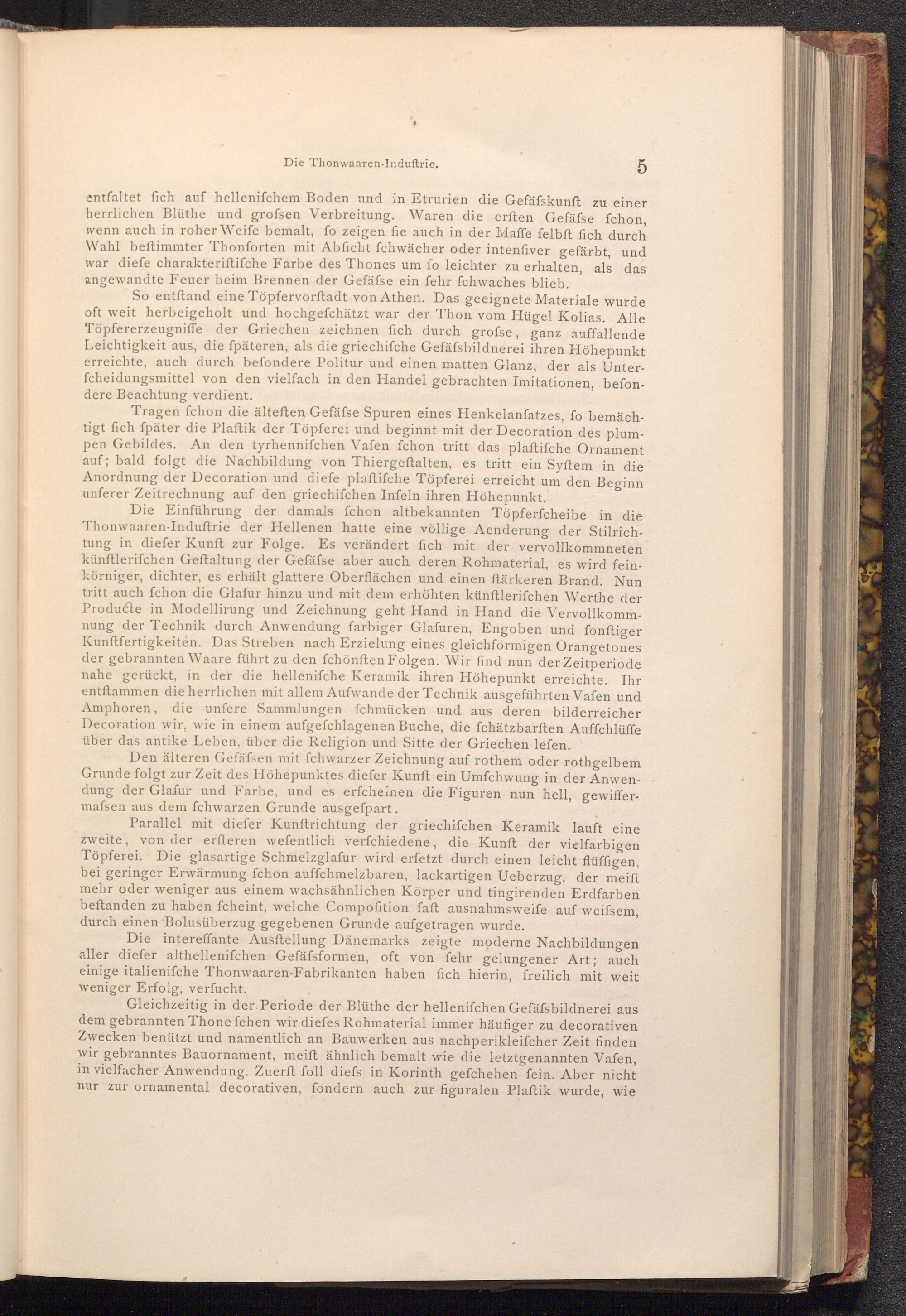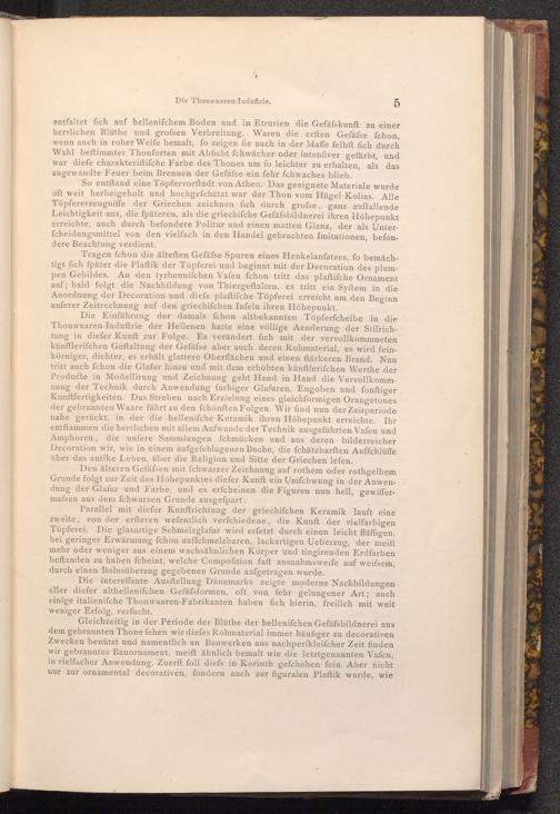 entfaltet fich auf hellenifchem Boden und in Etrurien die Gefäfskunft zu einer herrlichen Blüthe und grofsen Verbreitung. Waren die erften Gefäfse fchon, wenn auch in roher Weife bemalt, fo zeigen fie auch in der Maffe felbft fich durch Wahl beftimmter Thonforten mit Abficht fchwächer oder intenfiver gefärbt, und war diefe charakteriftifche Farbe des Thones um fo leichter zu erhalten, als das angewandte Feuer beim Brennen der Gefäfse ein fehr fchwaches blieb.