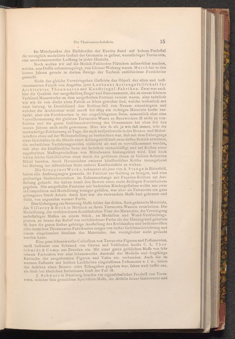 Eine ganz fehenswerthe Collection von Terracotta- Figuren und Poftamenten, meift beftimmt zum Schmuck von Gärten und Veftibulen fandte C. L. Thorfchmidt& Comp. aus Dresden ein. Mit einer guten gelblichen Maffe von fehr reinem Farbenton war eine lobenswerthe Auswahl der Modelle und forgfältige Retouche der ausgeformten Figuren und Vafen etc. verbunden. Auch die im warmen Zuftande mit heifsen Lackfarben eingelaffenen Poftamente u. f. w., denen das Anfehen eines Bronce- oder Eifengufses gegeben war, fahen weit beffer aus, als diefs bei ähnlichen Imitationen fonft der Fall ift.