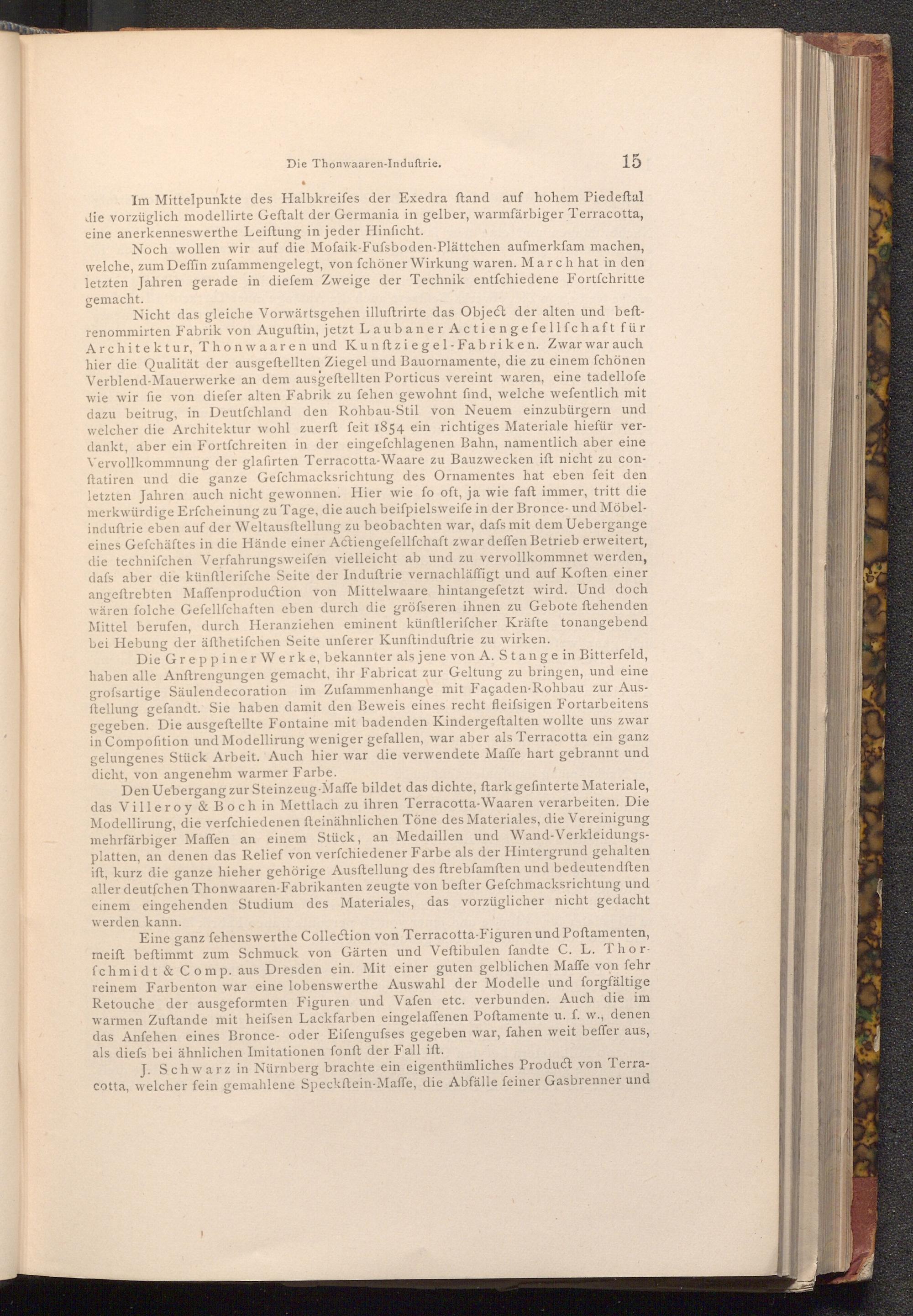 Die Greppiner Werke, bekannter als jene von A. Stange in Bitterfeld, haben alle Anftrengungen gemacht, ihr Fabricat zur Geltung zu bringen, und eine grofsartige Säulendecoration im Zufammenhange mit Façaden- Rohbau zur Ausftellung gefandt. Sie haben damit den Beweis eines recht fleifsigen Fortarbeitens gegeben. Die ausgeftellte Fontaine mit badenden Kindergeftalten wollte uns zwar in Compofition und Modellirung weniger gefallen, war aber als Terracotta ein gelungenes Stück Arbeit. Auch hier war die verwendete Maffe hart gebrannt und dicht, von angenehm warmer Farbe.