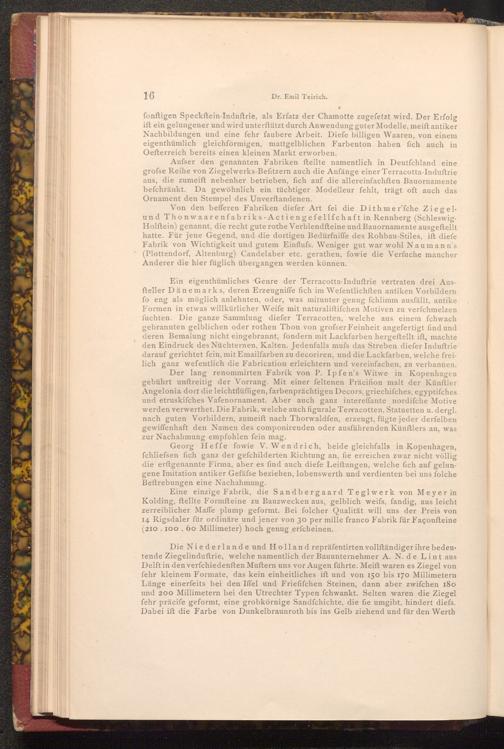 Aufser den genannten Fabriken ftellte namentlich in Deutfchland eine grofse Reihe von Ziegelwerks- Befitzern auch die Anfänge einer Terracotta- Induftrie aus, die zumeift nebenher betrieben, fich auf die allereinfachften Bauornamente befchränkt. Da gewöhnlich ein tüchtiger Modelleur fehlt, trägt oft auch das Ornament den Stempel des Unverftandenen.