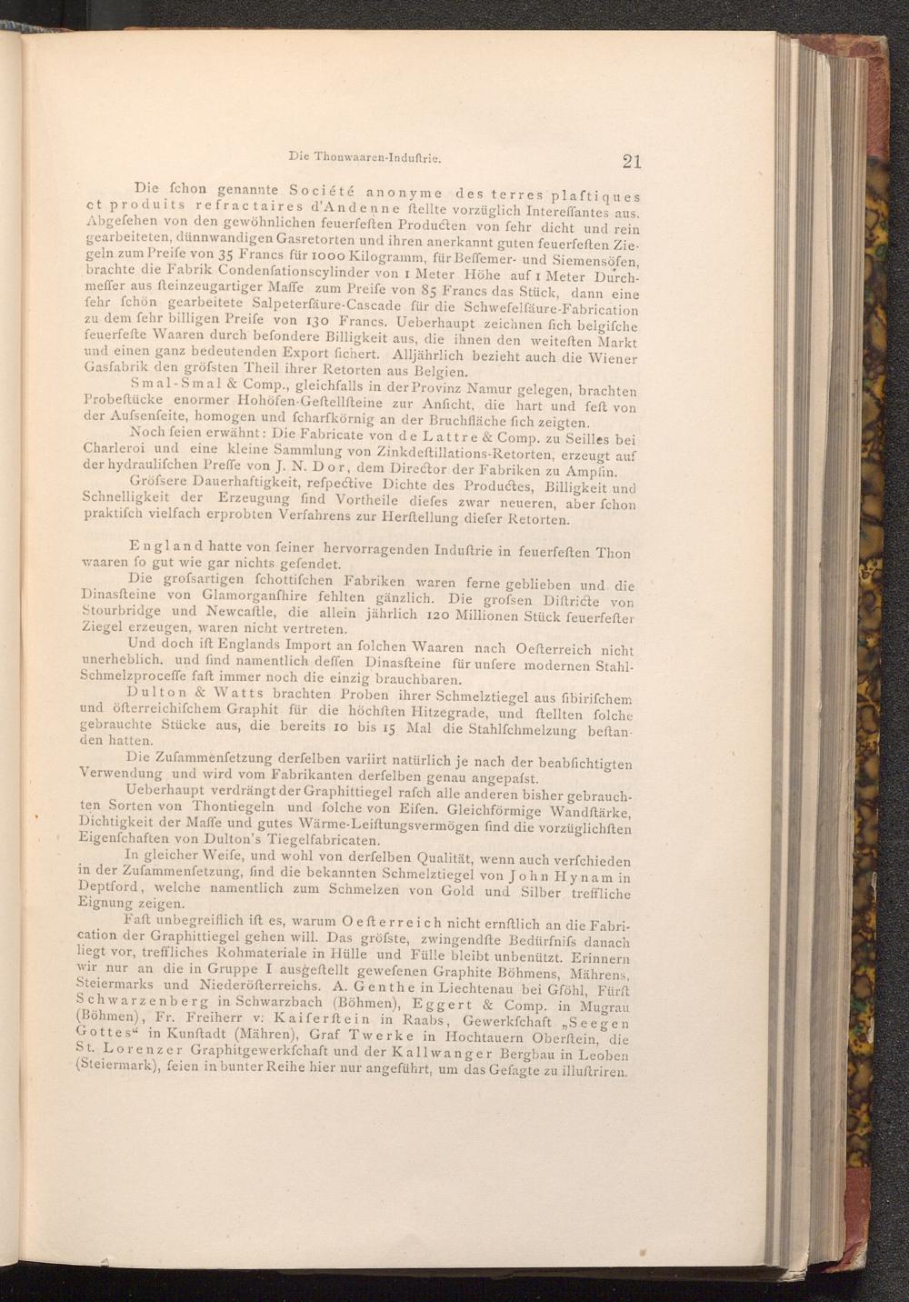 Die fchon genannte Société anonyme des terres plaftiques ct produits refractaires d'Andenne ftellte vorzüglich Intereffantes aus. Abgefehen von den gewöhnlichen feuerfeften Producten von fehr dicht und rein gearbeiteten, dünnwandigen Gasretorten und ihren anerkannt guten feuerfeften Ziegeln zum Preife von 35 Francs für 1000 Kilogramm, für Beffemer- und Siemensöfen, brachte die Fabrik Condenſationscylinder von I Meter Höhe auf 1 Meter Durchmeffer aus fteinzeugartiger Maffe zum Preife von 85 Francs das Stück, dann eine fehr fchön gearbeitete Salpeterfäure- Cascade für die Schwefelfäure- Fabrication zu dem fehr billigen Preife von 130 Francs. Ueberhaupt zeichnen fich belgifche feuerfefte Waaren durch befondere Billigkeit aus, die ihnen den weiteften Markt und einen ganz bedeutenden Export fichert. Alljährlich bezieht auch die Wiener Gasfabrik den gröfsten Theil ihrer Retorten aus Belgien.