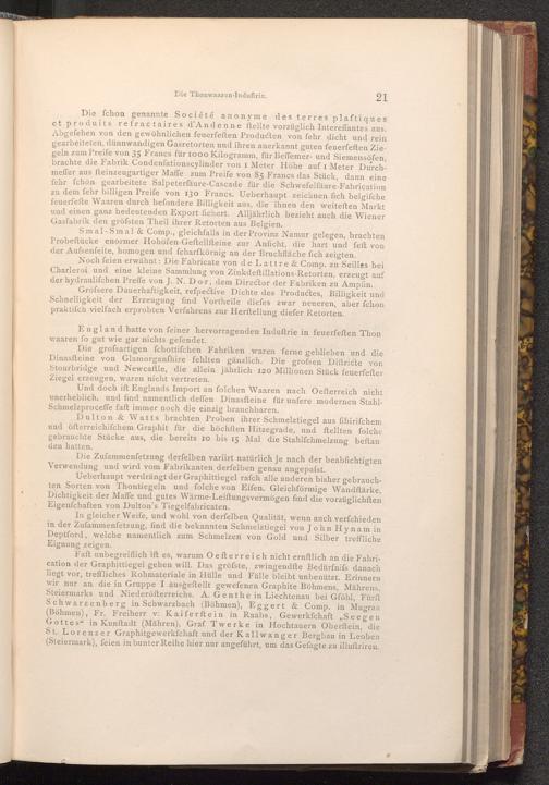 Dulton& Watts brachten Proben ihrer Schmelztiegel aus fibirifchem und öfterreichifchem Graphit für die höchften Hitzegrade, und ftellten folche gebrauchte Stücke aus, die bereits 10 bis 15 Mal die Stahlfchmelzung beftan