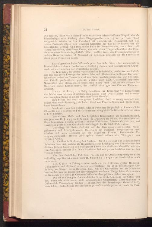 Von dichter Maffe und den belgifchen Erzeugniffen am nächften ftehend, find jene von H. J. Vygen& Comp. in Duisburg am Rhein. Sie excelliren mit ihren bekannten, koloffal grofsen Hohöfen- Wallfteinen, fchönen Gasretorten, und vorzüglich gearbeiteten Graphit- Schmelztiegeln für Gufsftahl- Fabrication.