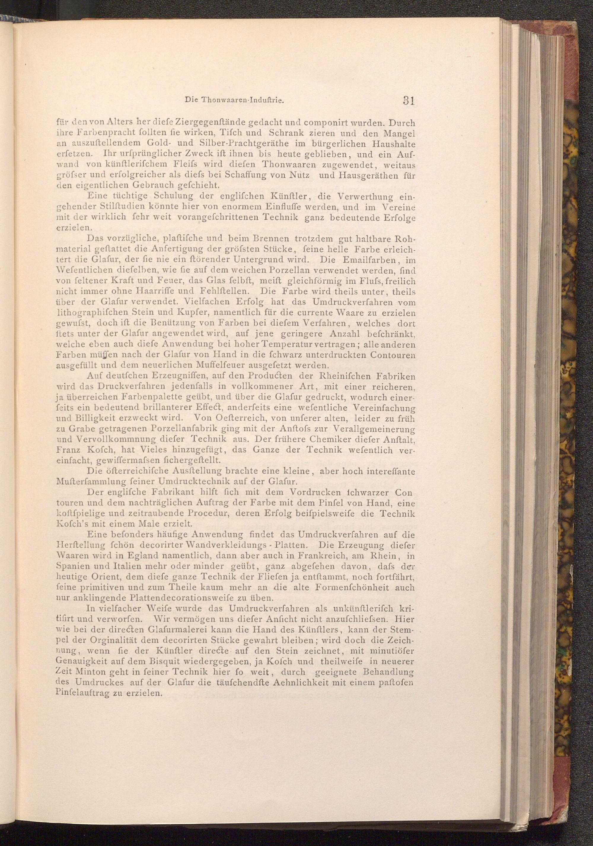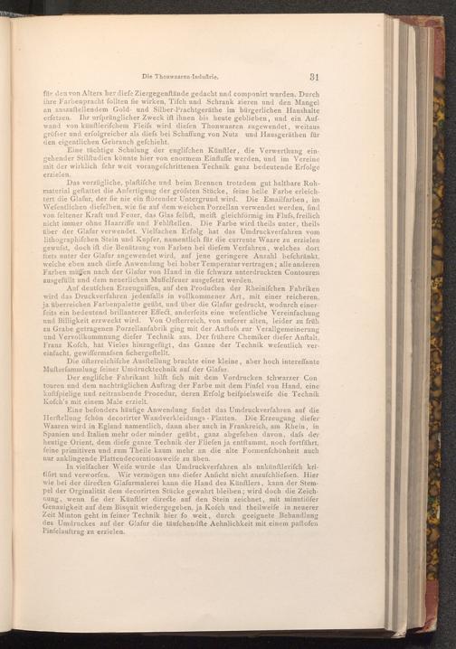 Auf deutfchen Erzeugniffen, auf den Producten der Rheinifchen Fabriken wird das Druckverfahren jedenfalls in vollkommener Art, mit einer reicheren, ja überreichen Farbenpalette geübt, und über die Glafur gedruckt, wodurch einerfeits ein bedeutend brillanterer Effect, anderfeits eine wefentliche Vereinfachung und Billigkeit erzweckt wird. Von Oefterreich, von unferer alten, leider zu früh zu Grabe getragenen Porzellanfabrik ging mit der Anftofs zur Verallgemeinerung und Vervollkommnung diefer Technik aus. Der frühere Chemiker diefer Anftalt, Franz Kofch, hat Vieles hinzugefügt, das Ganze der Technik wefentlich vereinfacht, gewiffermafsen fichergestellt.