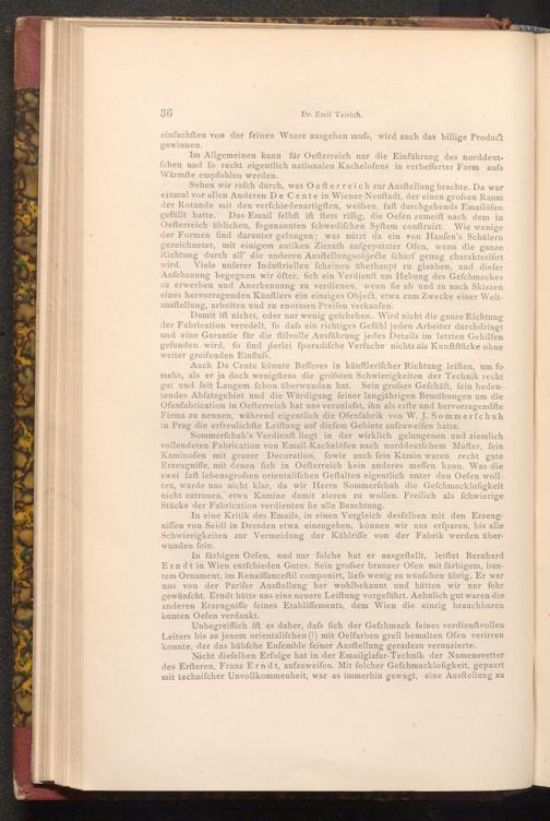 Auch De Cente könnte Befferes in künftlerifcher Richtung leiften, um fo mehr, als er ja doch wenigftens die gröfsten Schwierigkeiten der Technik recht gut und feit Langem fchon überwunden hat. Sein grofses Gefchäft, fein bedeutendes Abfatzgebiet und die Würdigung feiner langjährigen Bemühungen um die Ofenfabrication in Oefterreich hat uns veranlafst, ihn als erfte und hervorragendfte Firma zu nennen, während eigentlich die Ofenfabrik von W. J. Sommerfchuh in Prag die erfreulichfte Leiftung auf diefem Gebiete aufzuweifen hatte.