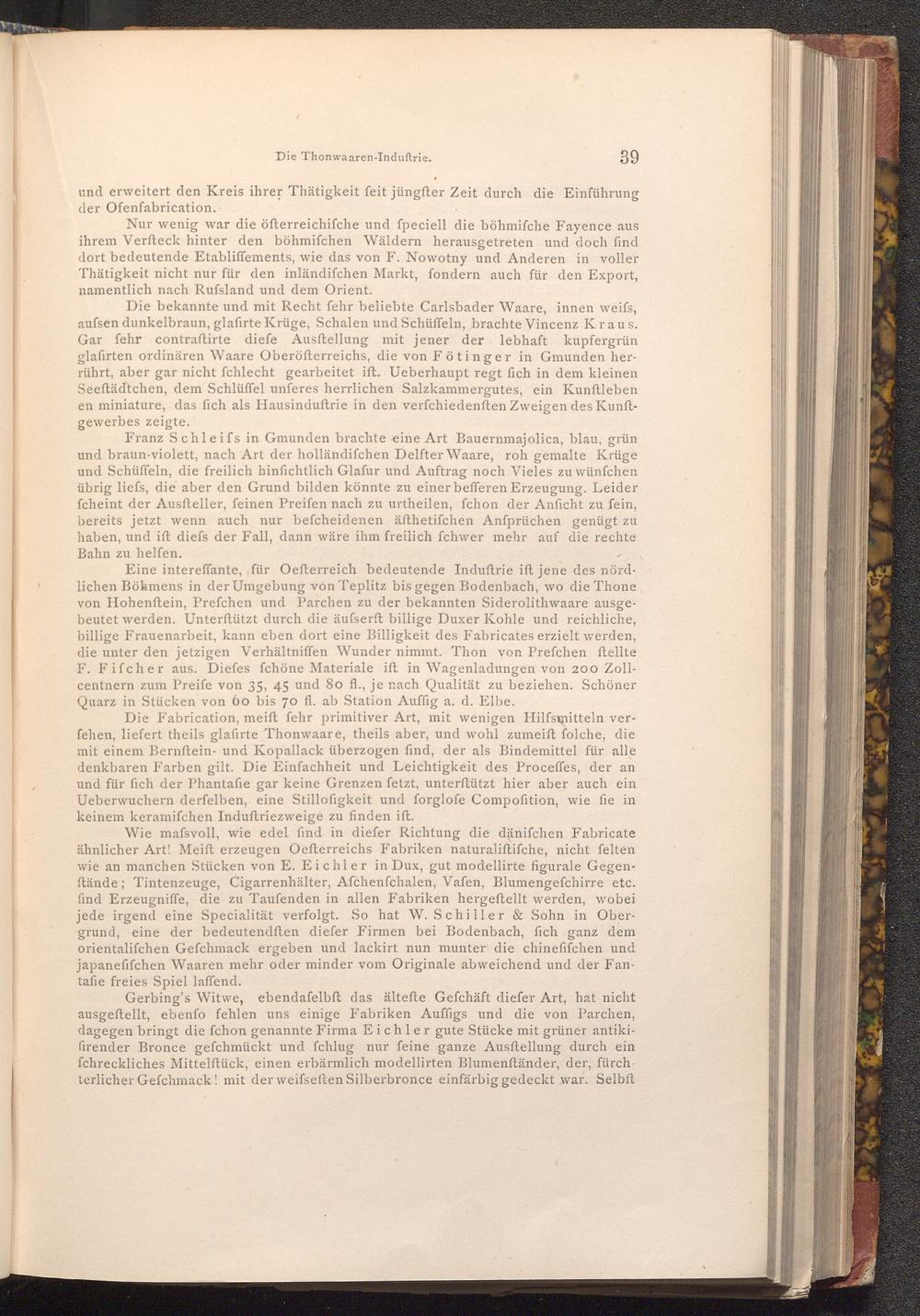 Eine intereffante, für Oefterreich bedeutende Induftrie ift jene des nördlichen Böhmens in der Umgebung von Teplitz bis gegen Bodenbach, wo die Thone von Hohenftein, Prefchen und Parchen zu der bekannten Siderolithwaare ausgebeutet werden. Unterſtützt durch die äufserft billige Duxer Kohle und reichliche, billige Frauenarbeit, kann eben dort eine Billigkeit des Fabricates erzielt werden, die unter den jetzigen Verhältniffen Wunder nimmt. Thon von Prefchen ftellte F. Fifcher aus. Diefes fchöne Materiale ift in Wagenladungen von 200 Zollcentnern zum Preife von 35, 45 und 80 fl., je nach Qualität zu beziehen. Schöner Quarz in Stücken von 60 bis 70 fl. ab Station Auffig a. d. Elbe.